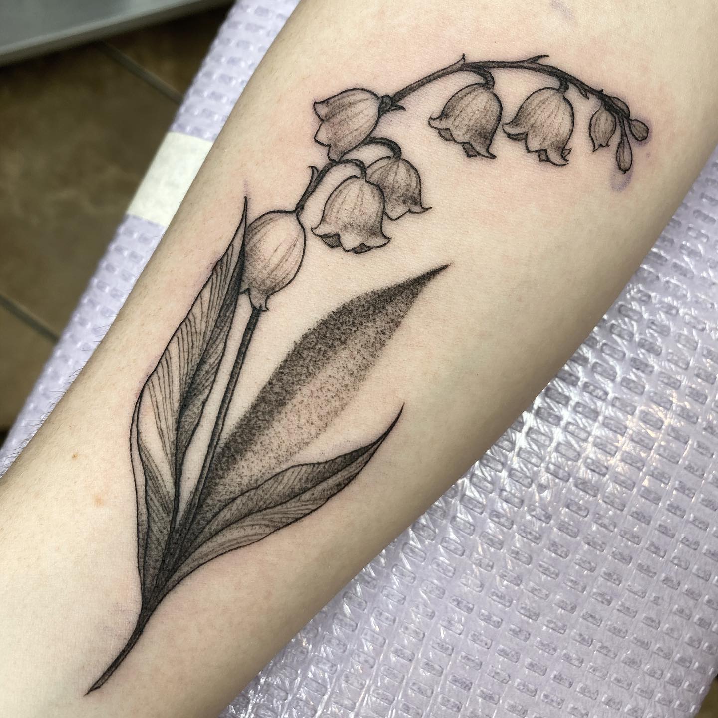 The tattoo showcases a delicate arrangement of Lily of the Valley flowers, highlighted by their distinct bell shape and graceful stems.