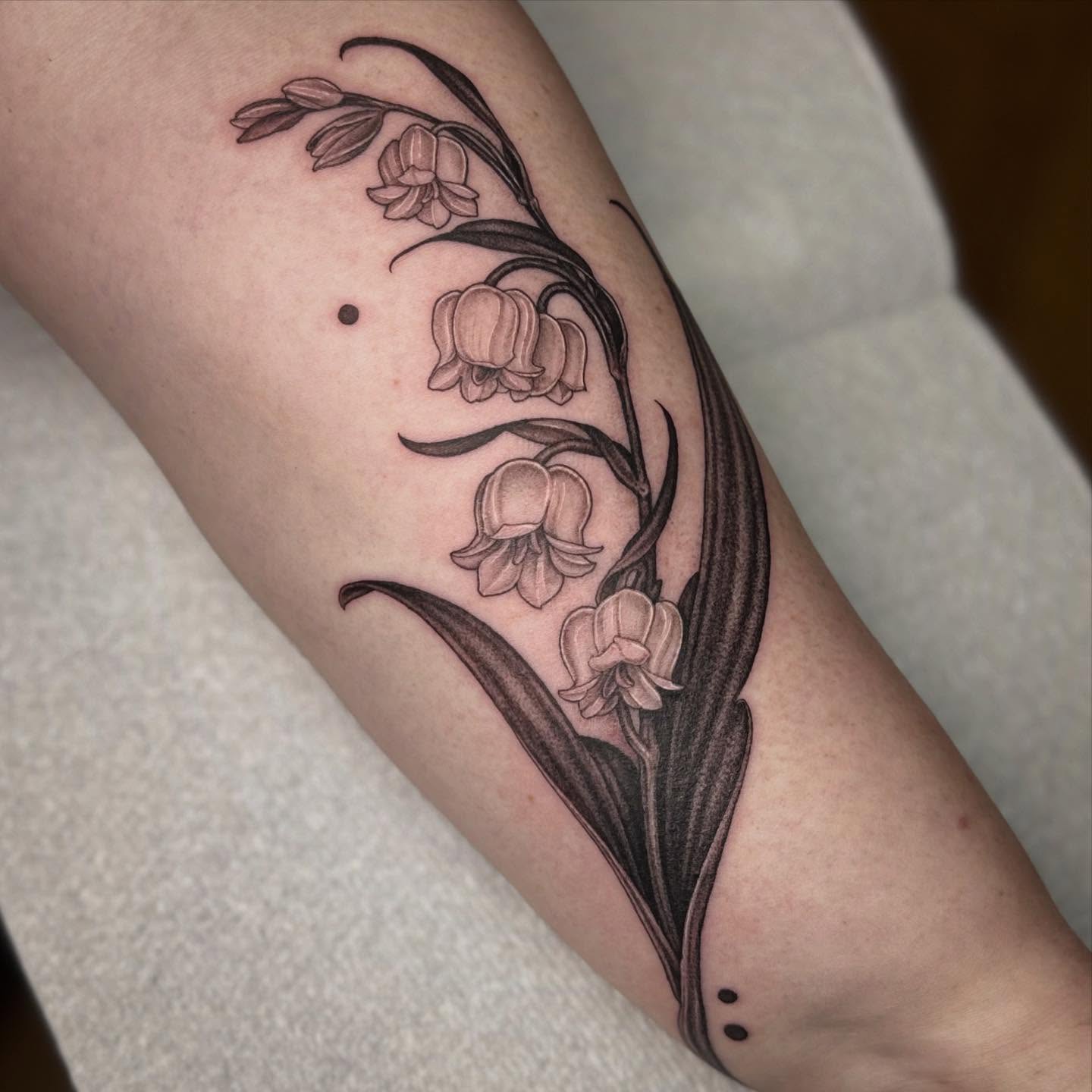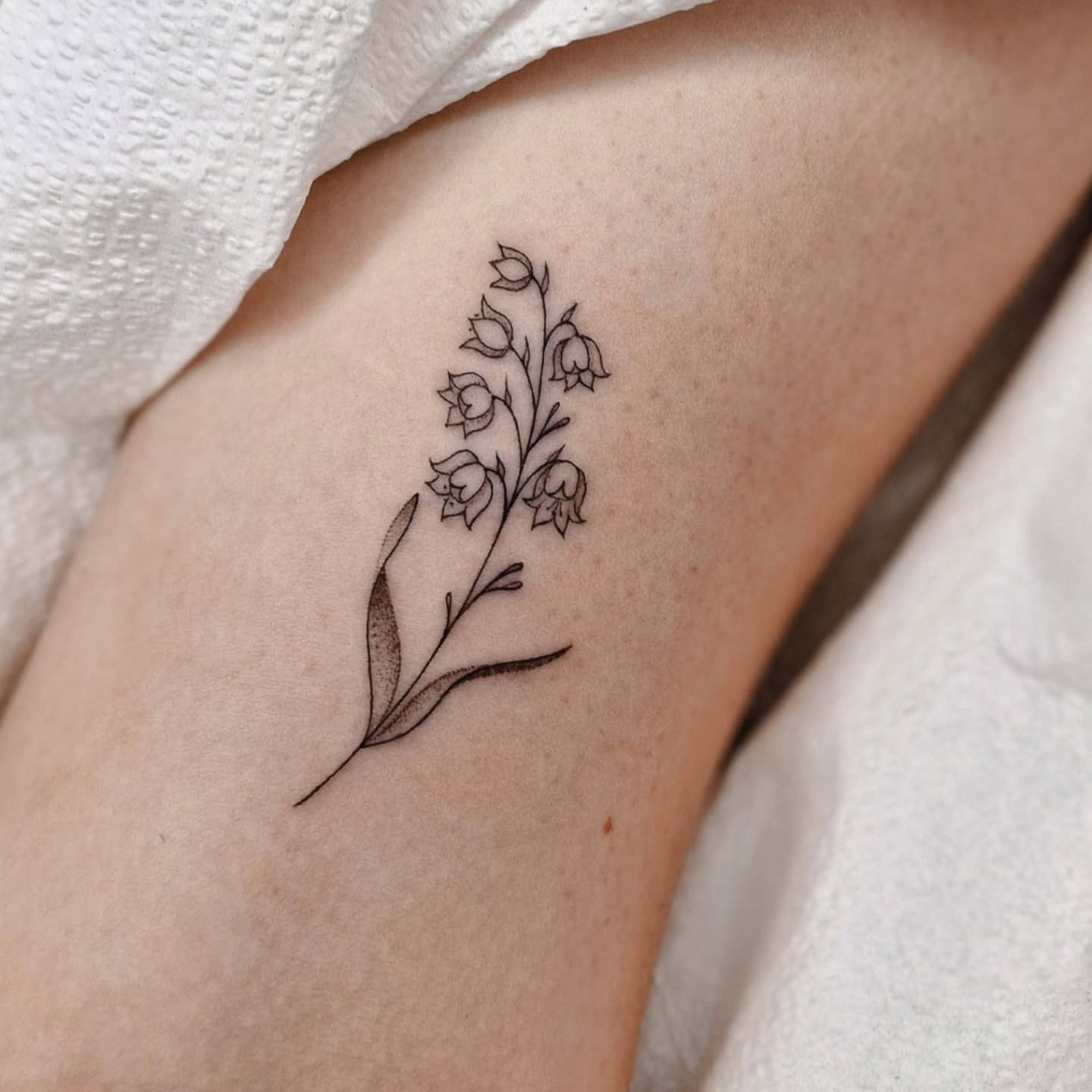The tattoo features a gracefully curved stem adorned with delicate bell-shaped flowers, capturing the essence of the Lily of the Valley.