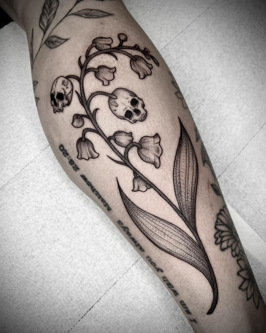 The tattoo features an intricate design of a Lily of the Valley plant, where the bell-shaped flowers are uniquely replaced with small skulls.