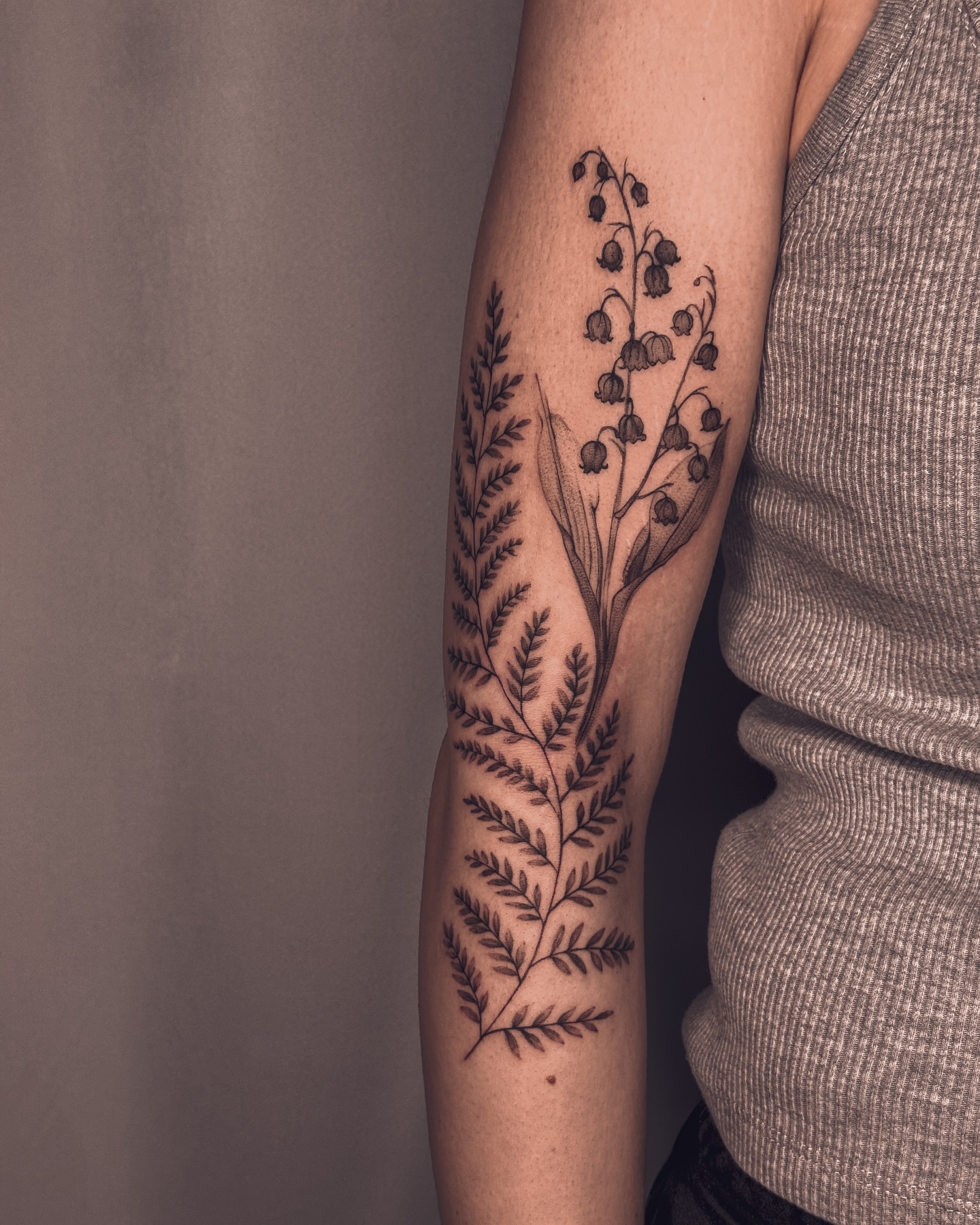 The tattoo showcases a detailed arrangement of Lily of the Valley flowers alongside delicate fern leaves.