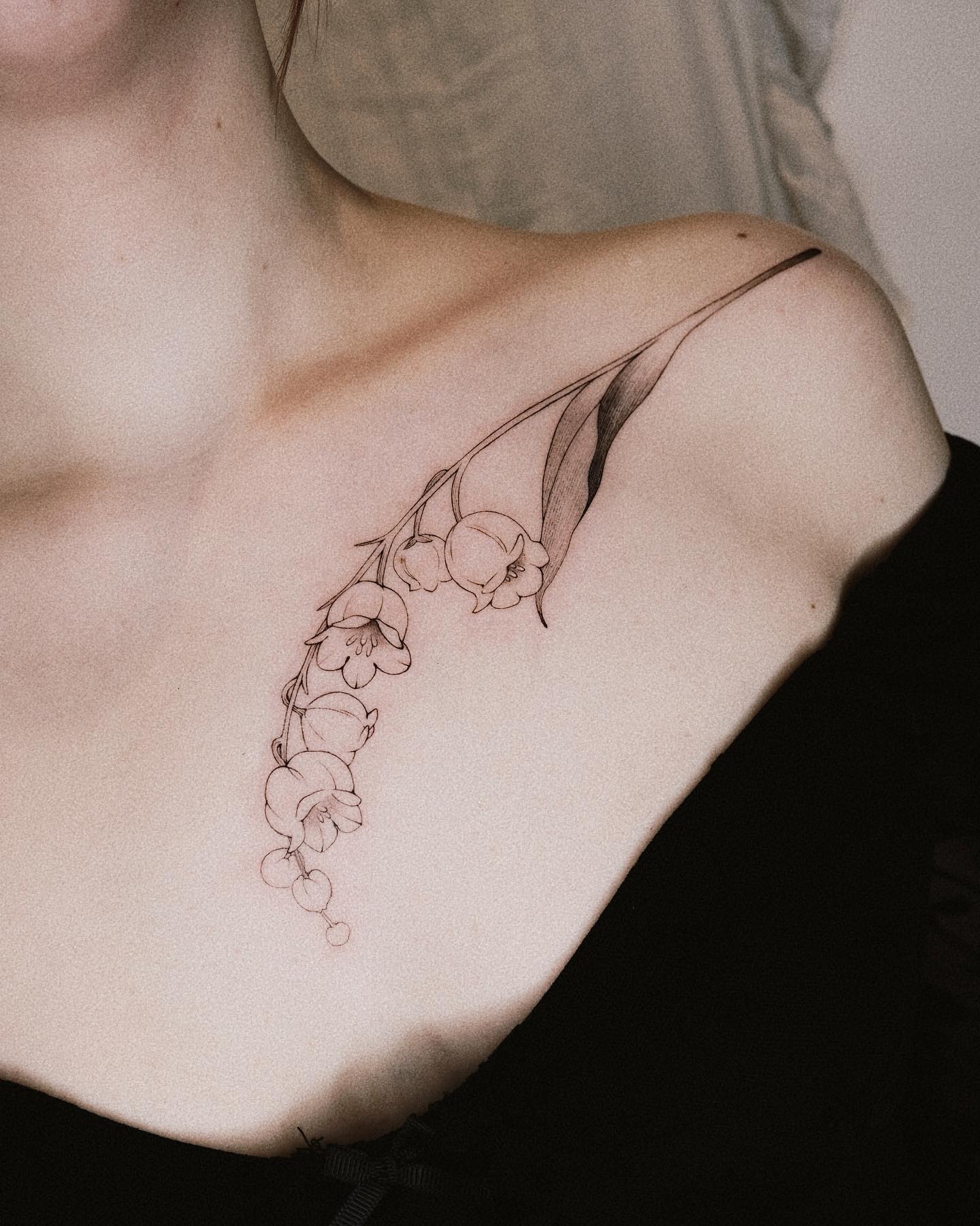 The tattoo features a graceful arrangement of Lily of the Valley flowers that elegantly curves along the shoulder.