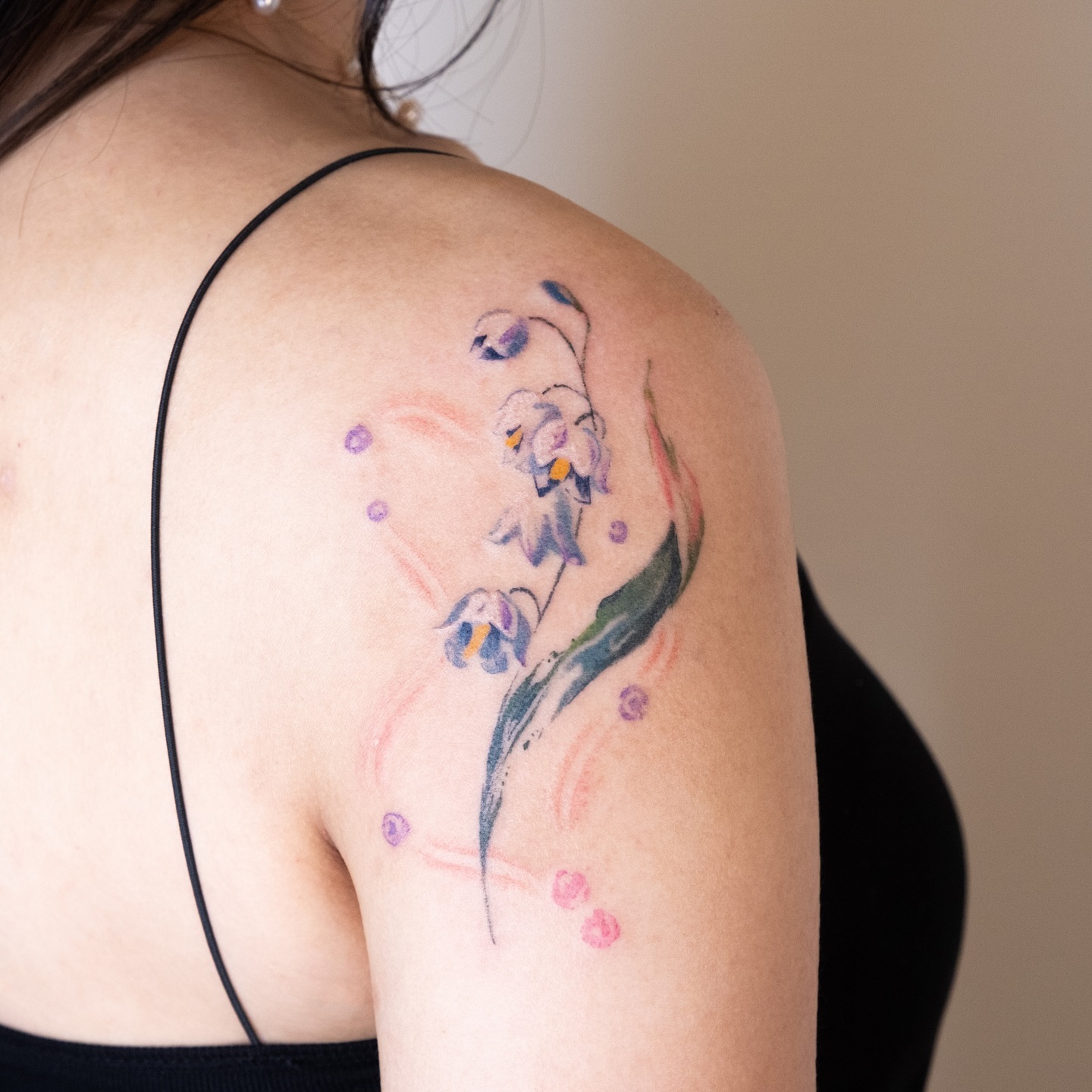 The tattoo showcases delicate Lily of the Valley flowers in soft watercolor hues, with gentle purples and subtle greens.
