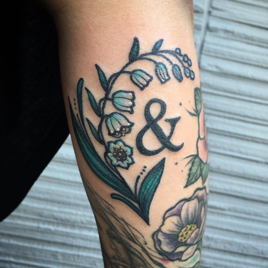 The tattoo features delicate Lily of the Valley flowers intertwined with bold leafy designs and an ampersand symbol.