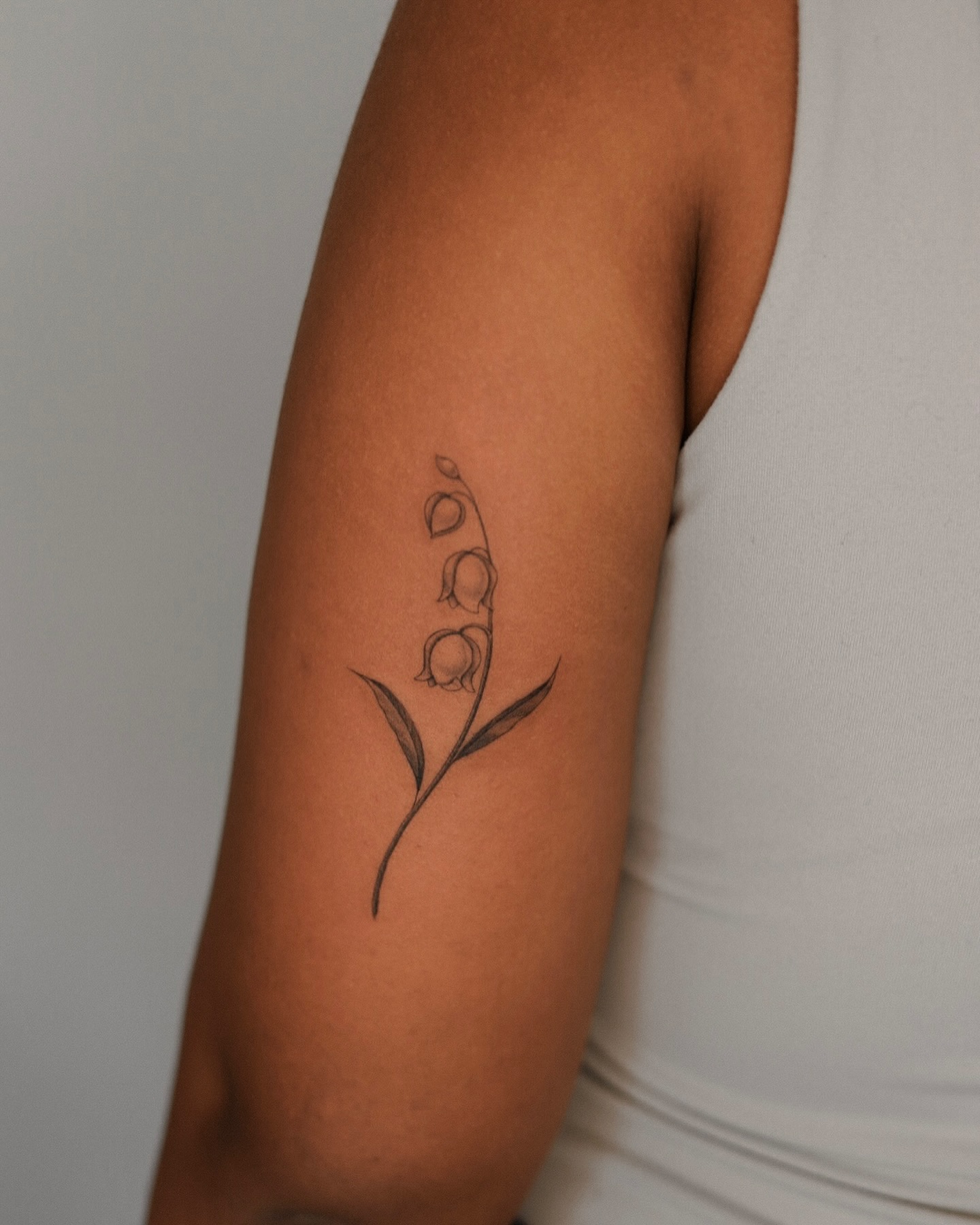 The tattoo features a slender stem adorned with small, bell-shaped flowers that characterize the Lily of the Valley.