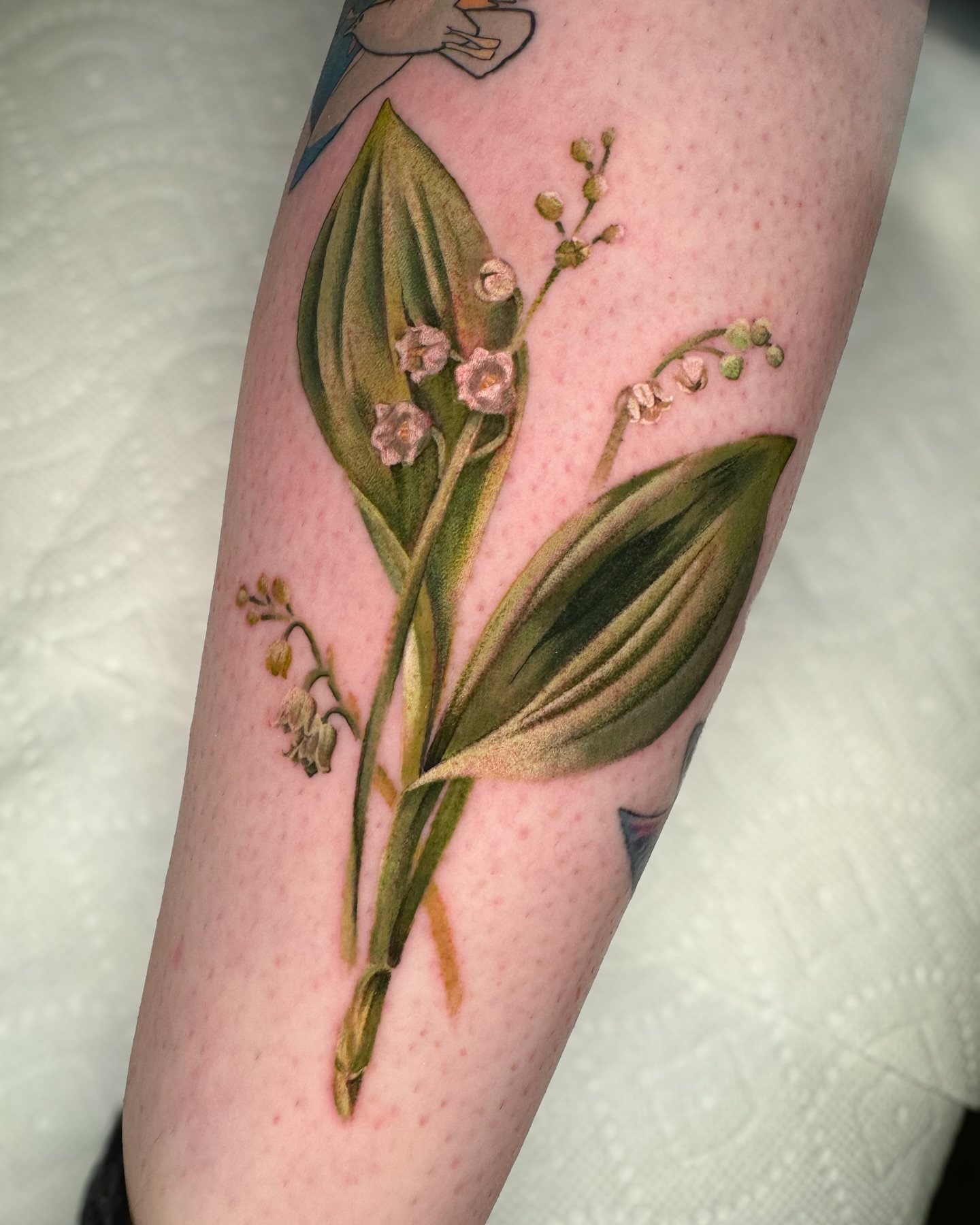 The tattoo features intricately detailed leaves and delicate flowers of the Lily of the Valley, showcasing a lifelike appearance.
