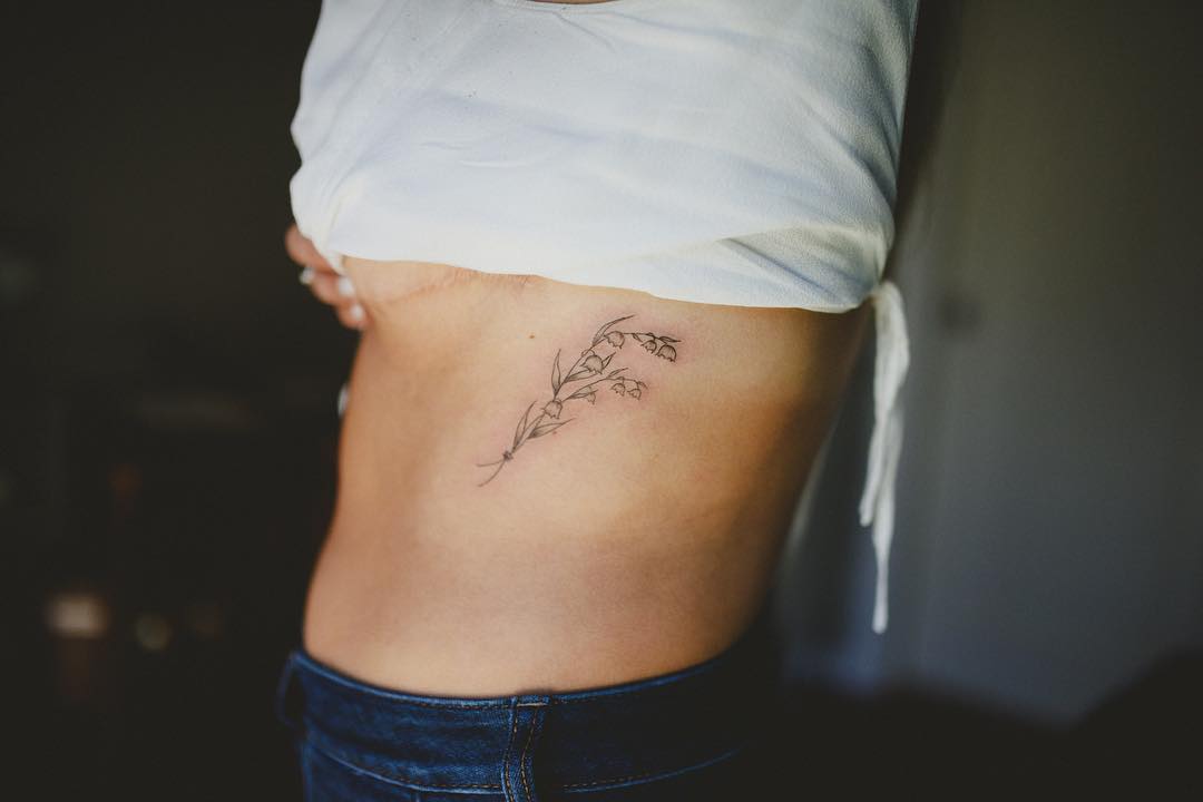 The tattoo features a delicate line drawing of lily of the valley flowers, arranged along a slender stem.