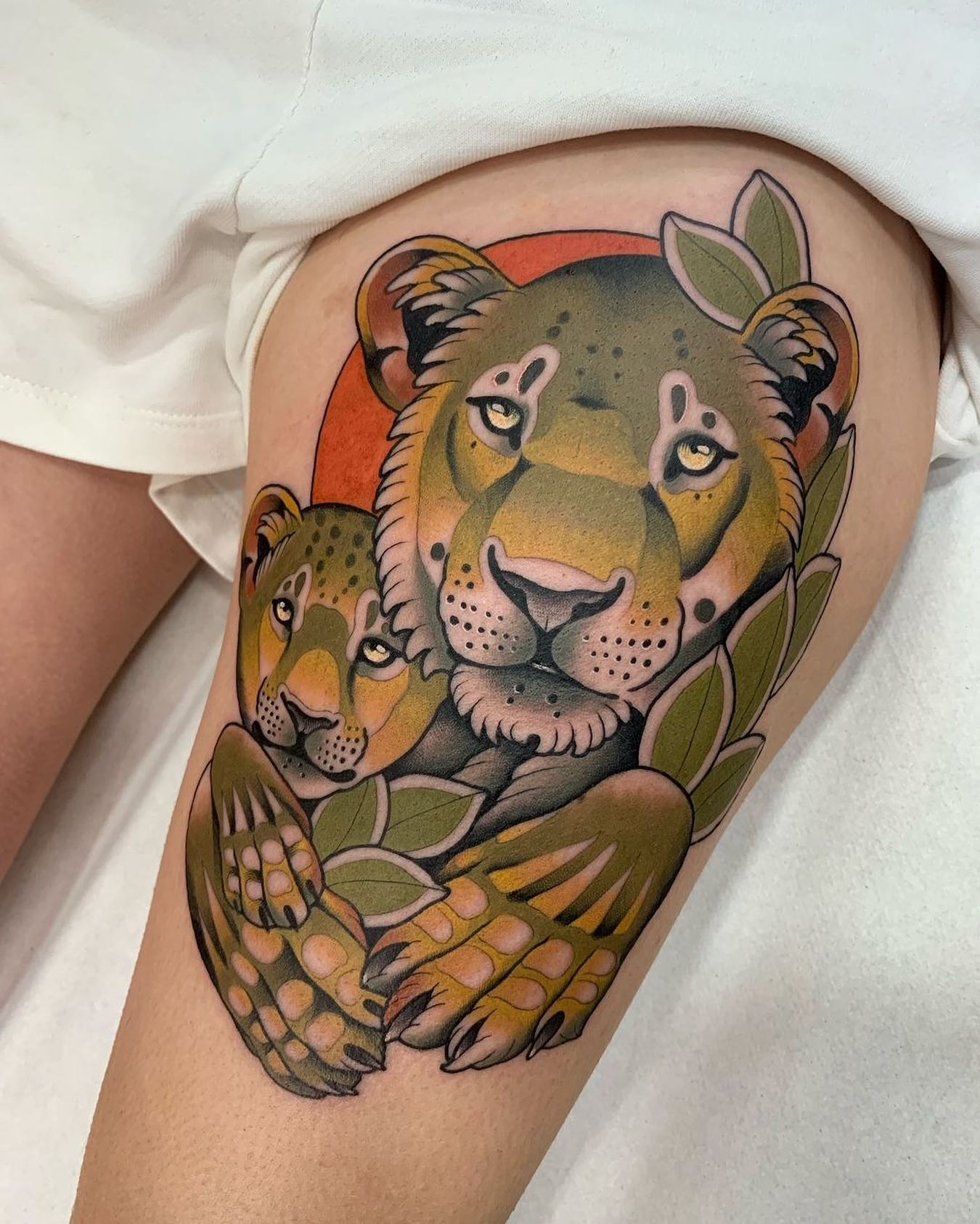 The tattoo features a large lion and its cub, both depicted with intricate detailing and a warm color palette.