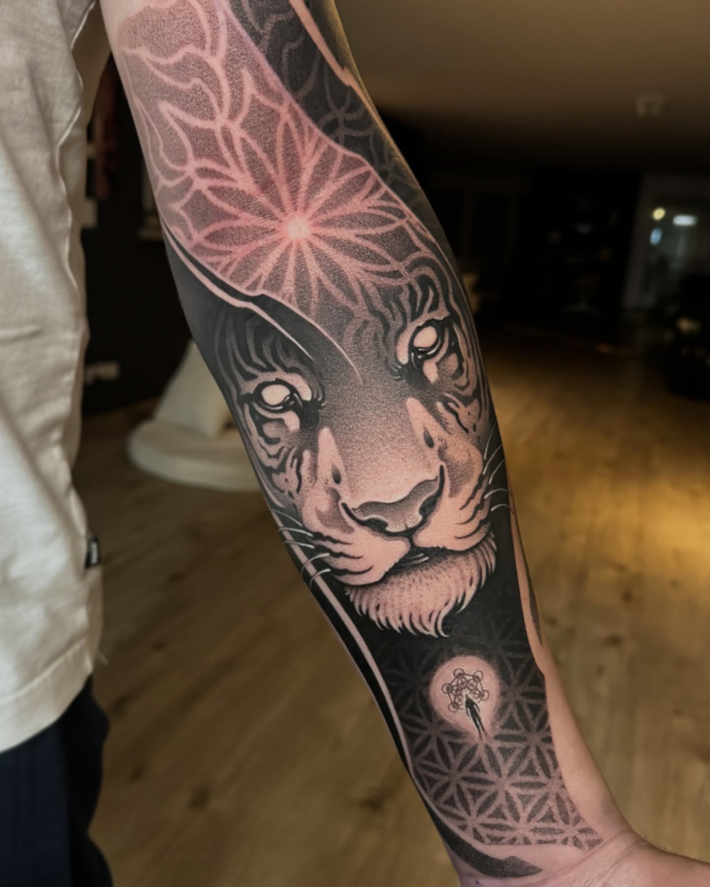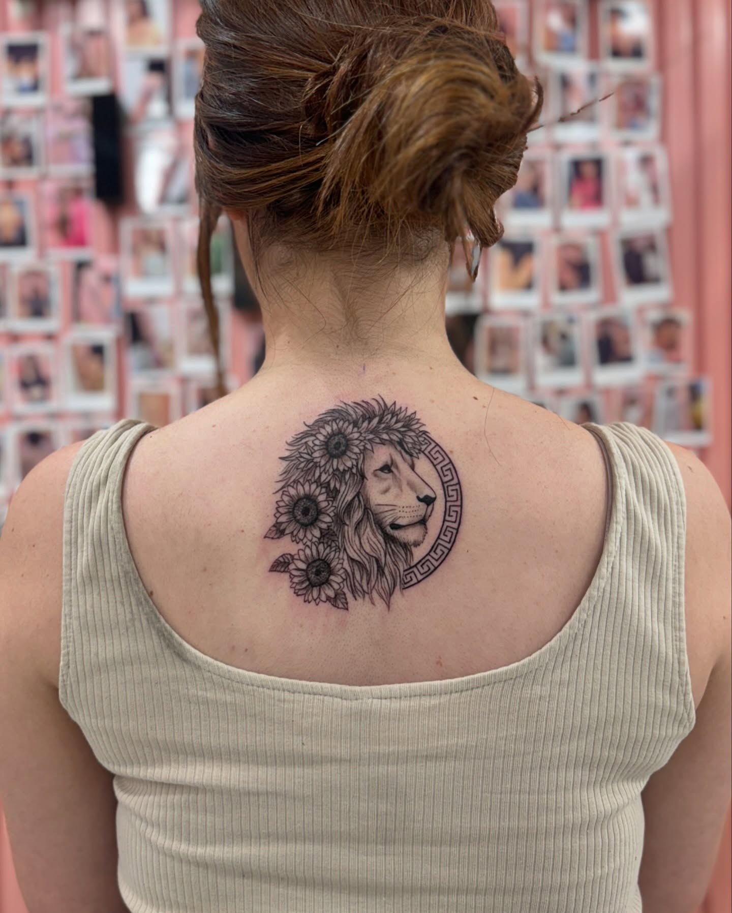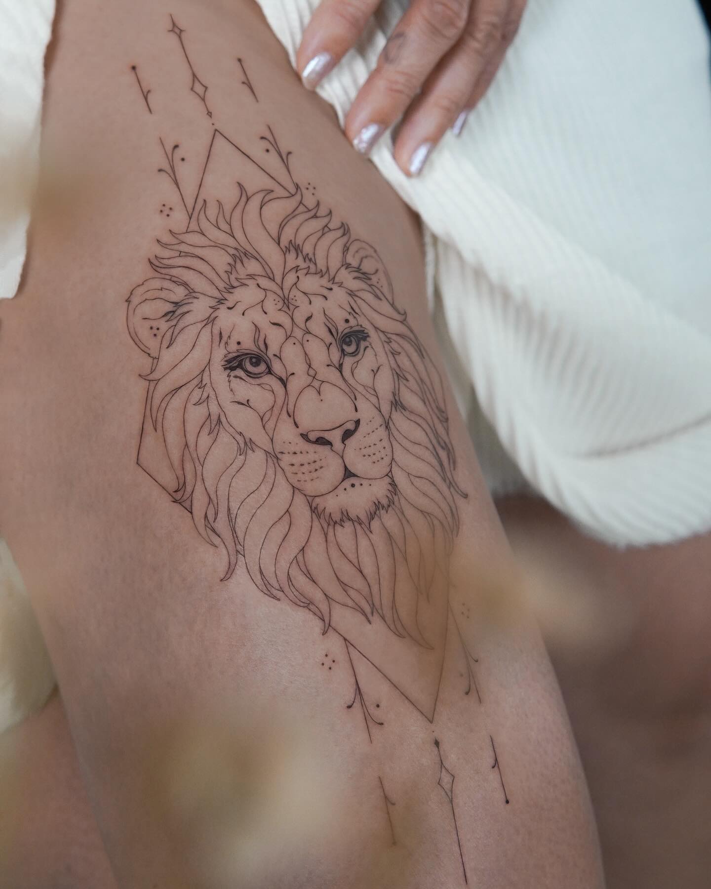 The tattoo features a lion’s face framed by geometric shapes and delicate floral elements.