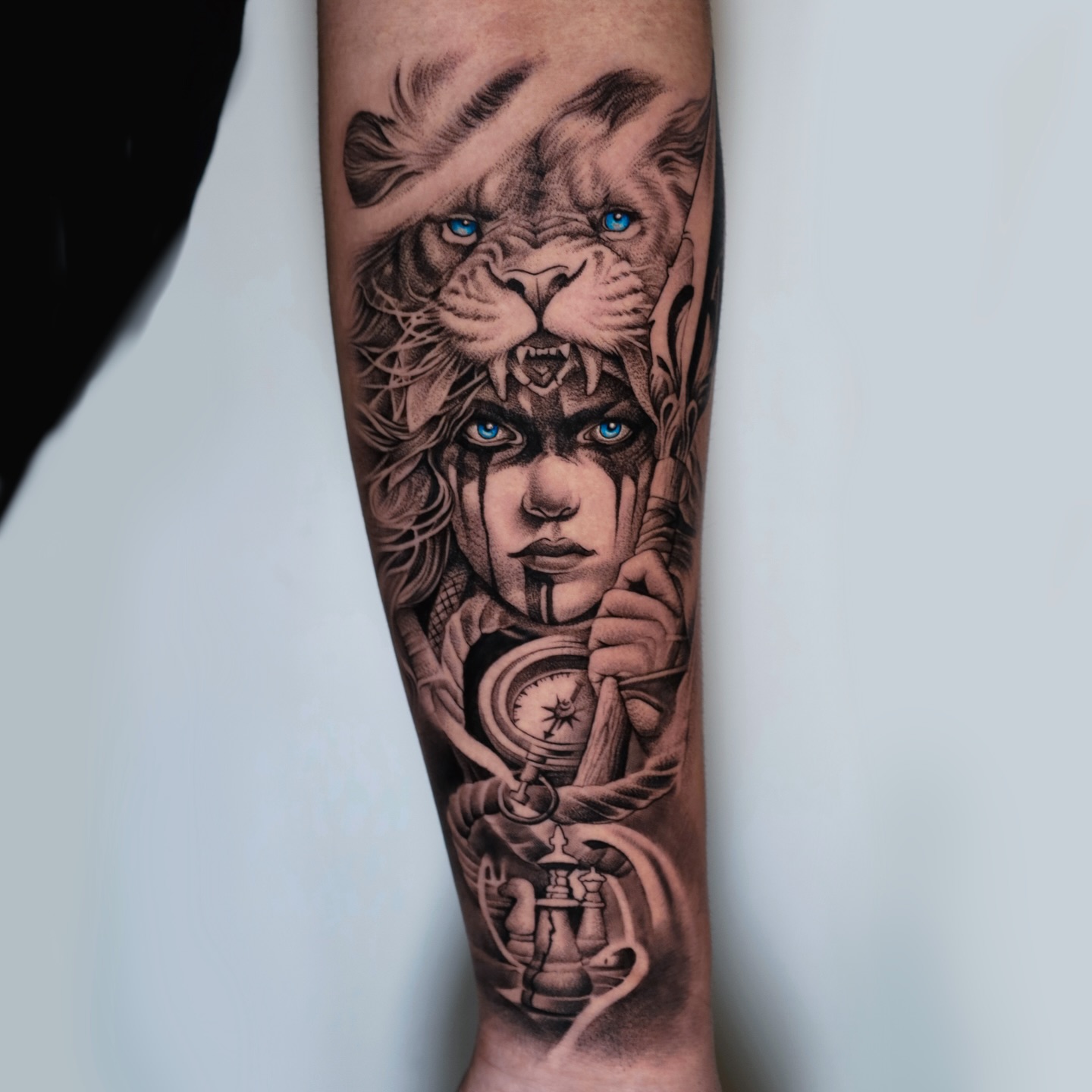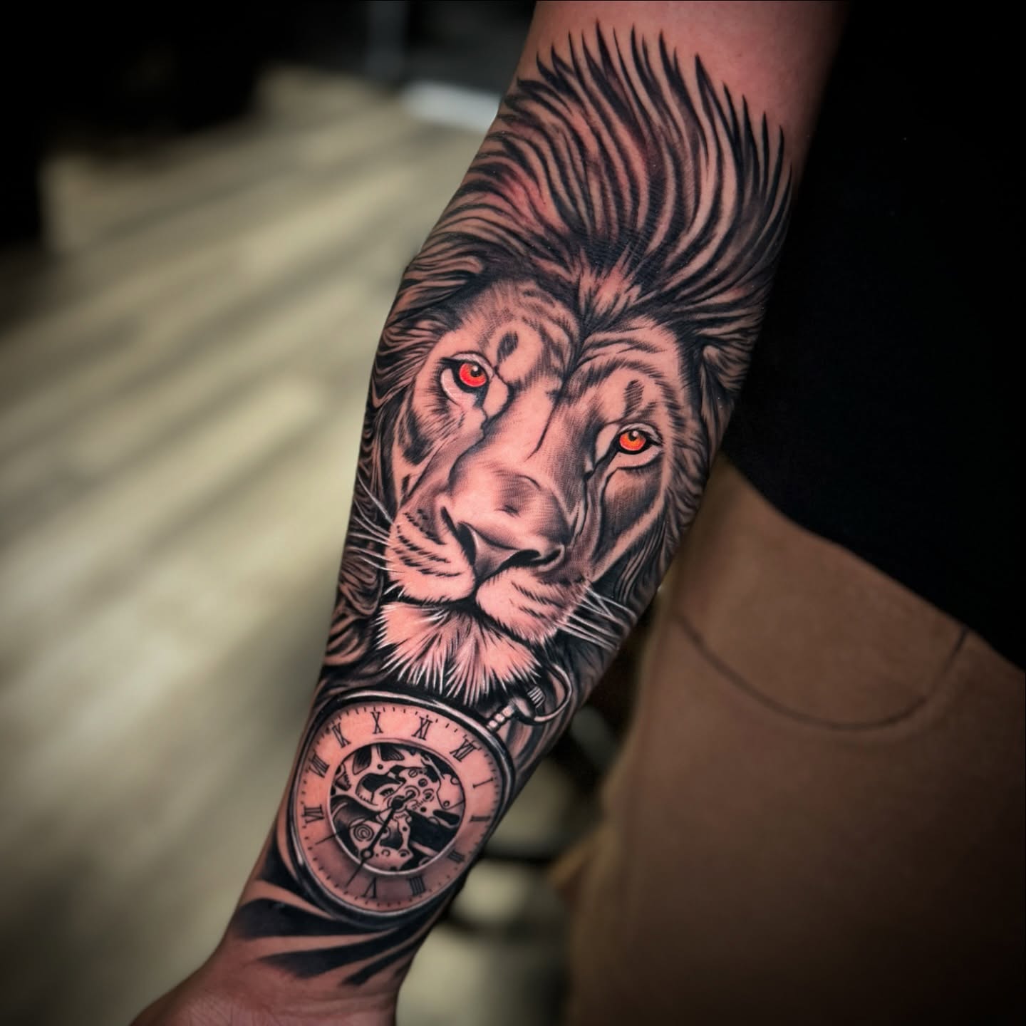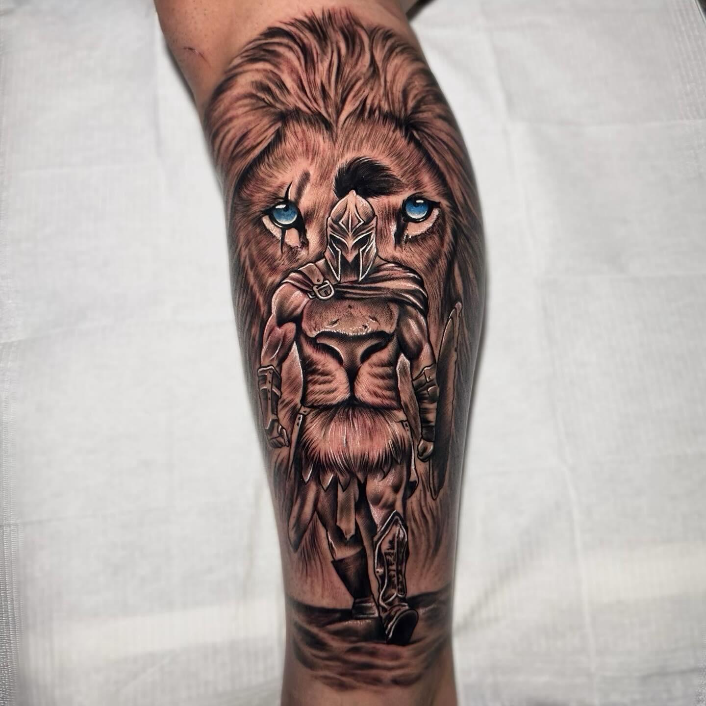 The tattoo features a detailed lion head at the top, characterized by its fierce expression and striking blue eyes.