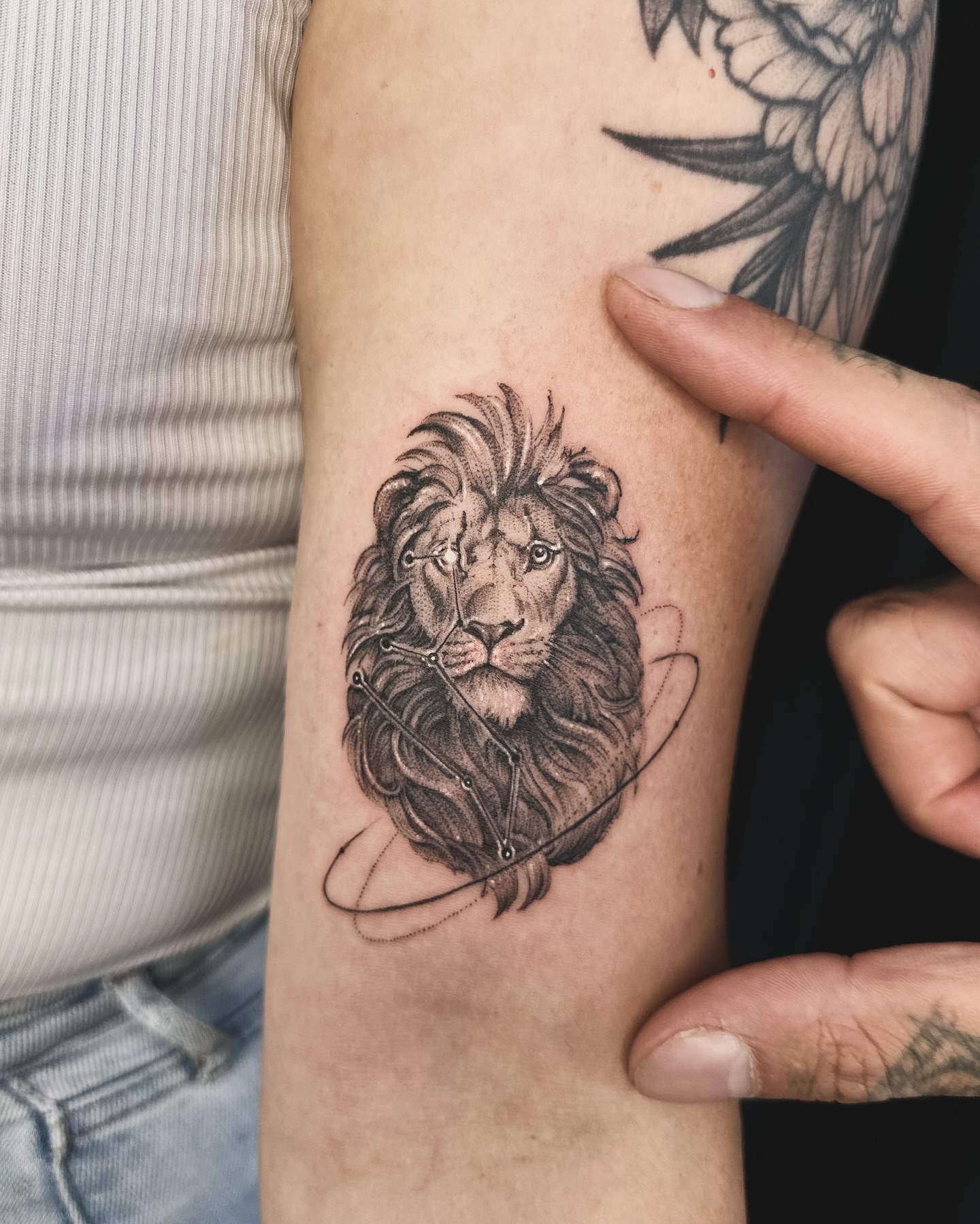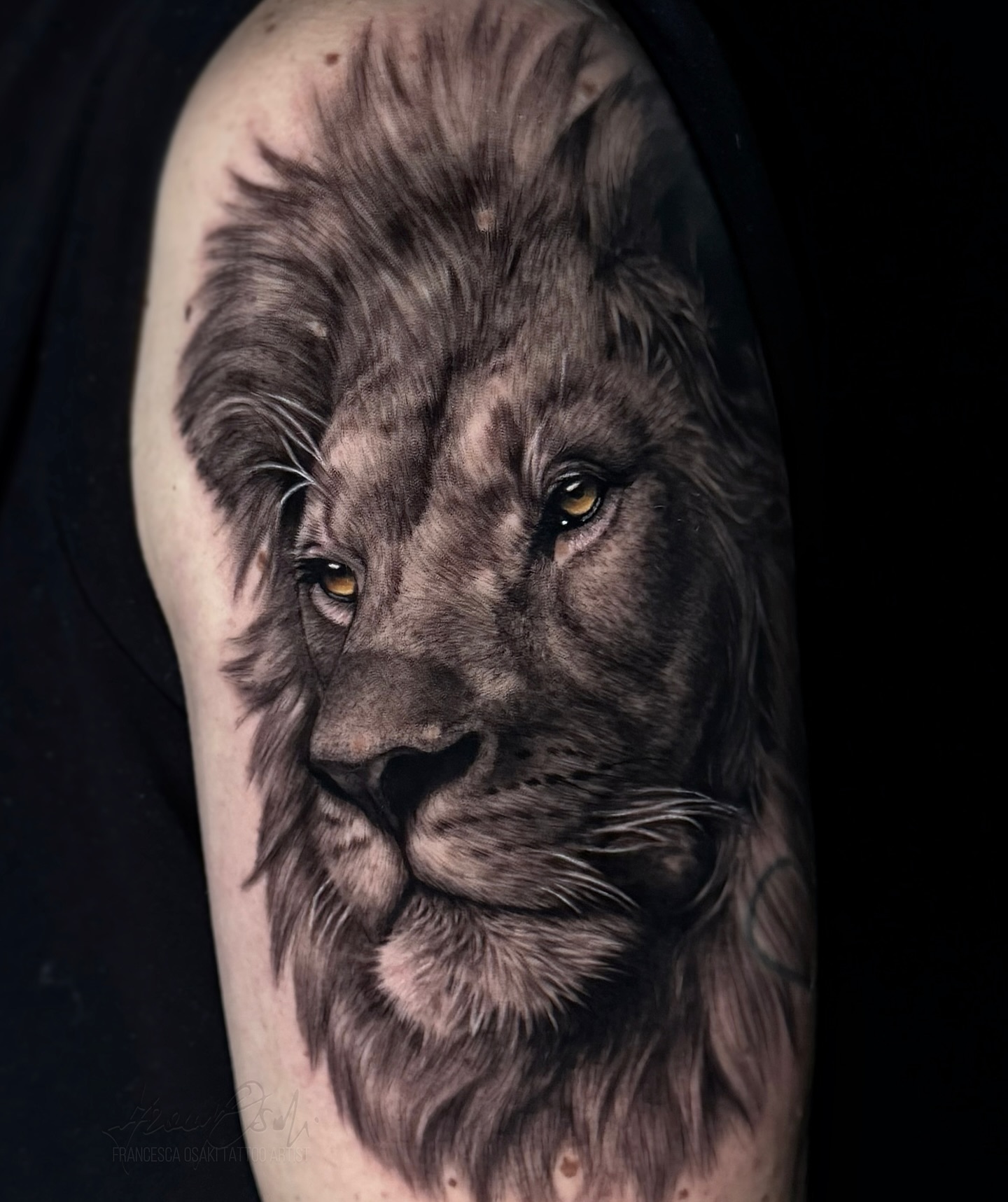 The tattoo features a detailed lion’s face, prominently showcasing its expressive eyes and intricate mane.