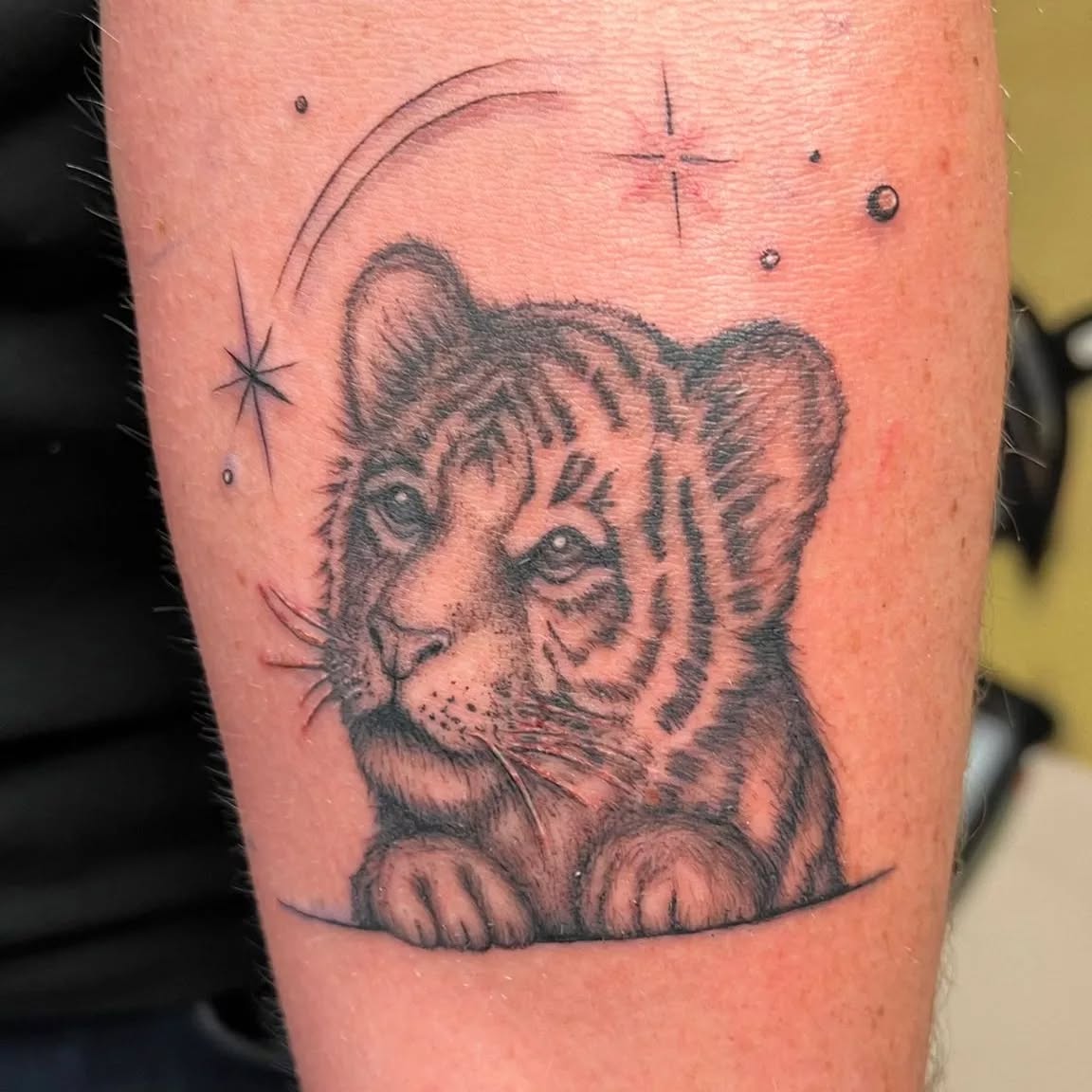 The tattoo features a playful tiger cub resting on its paws, with detailed stripes and a curious expression.