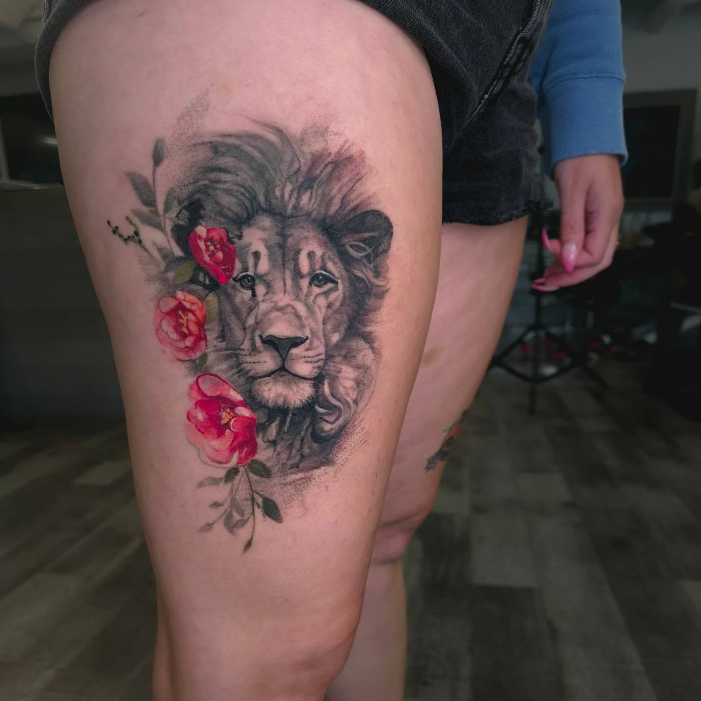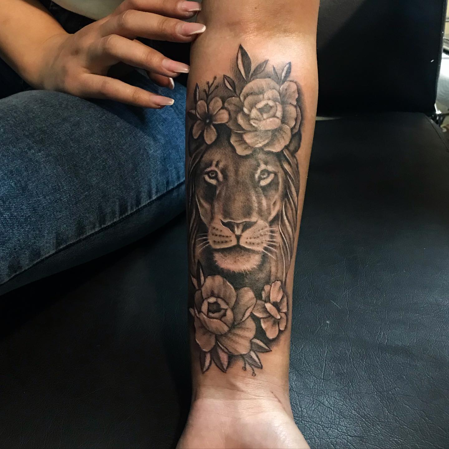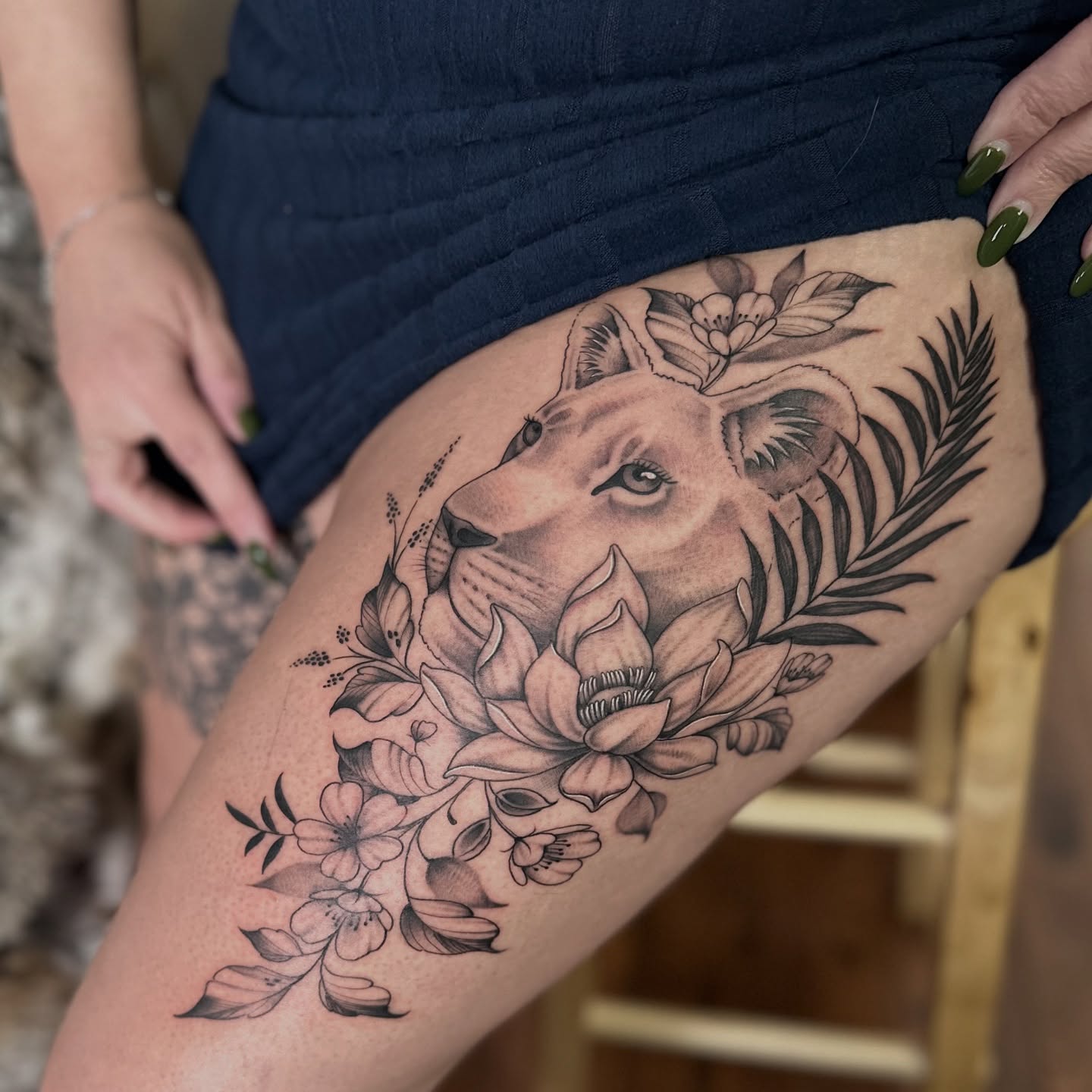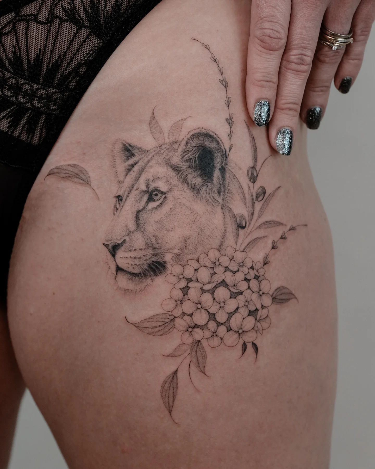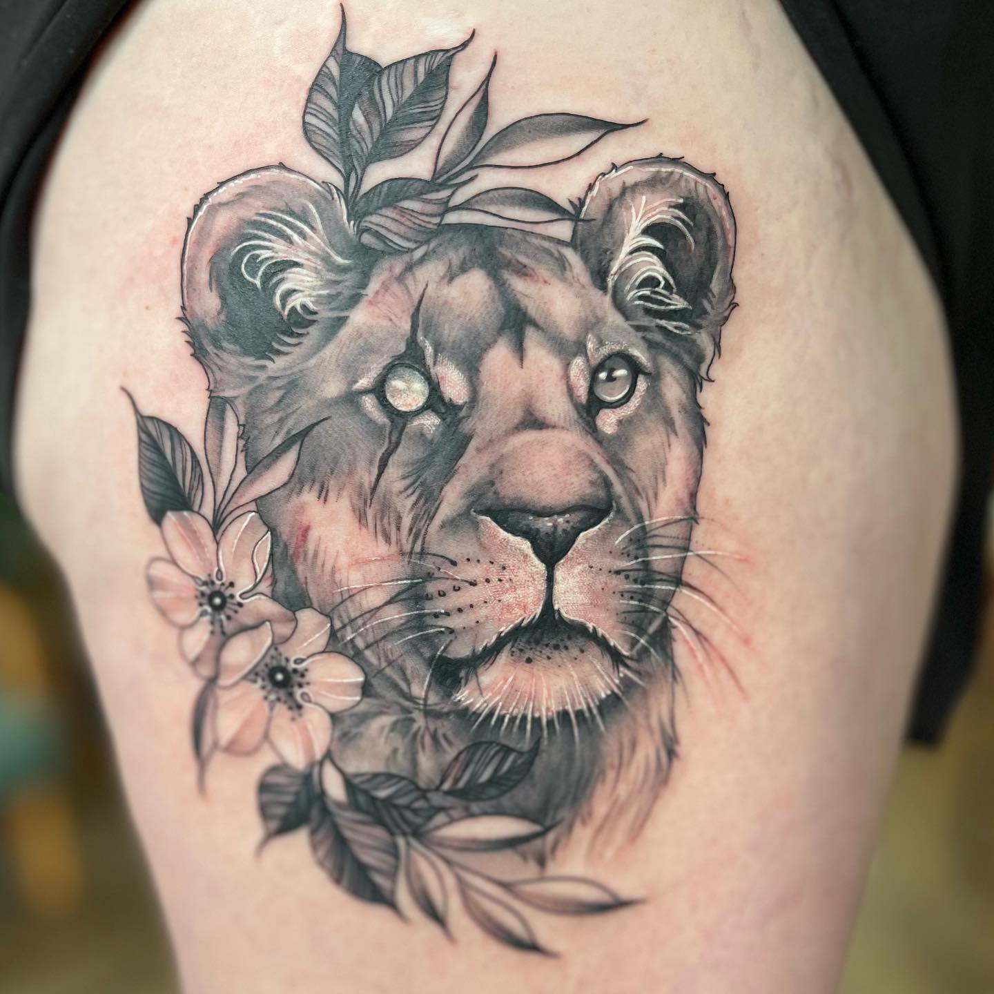 The tattoo features a detailed lioness portrait surrounded by delicate floral elements.