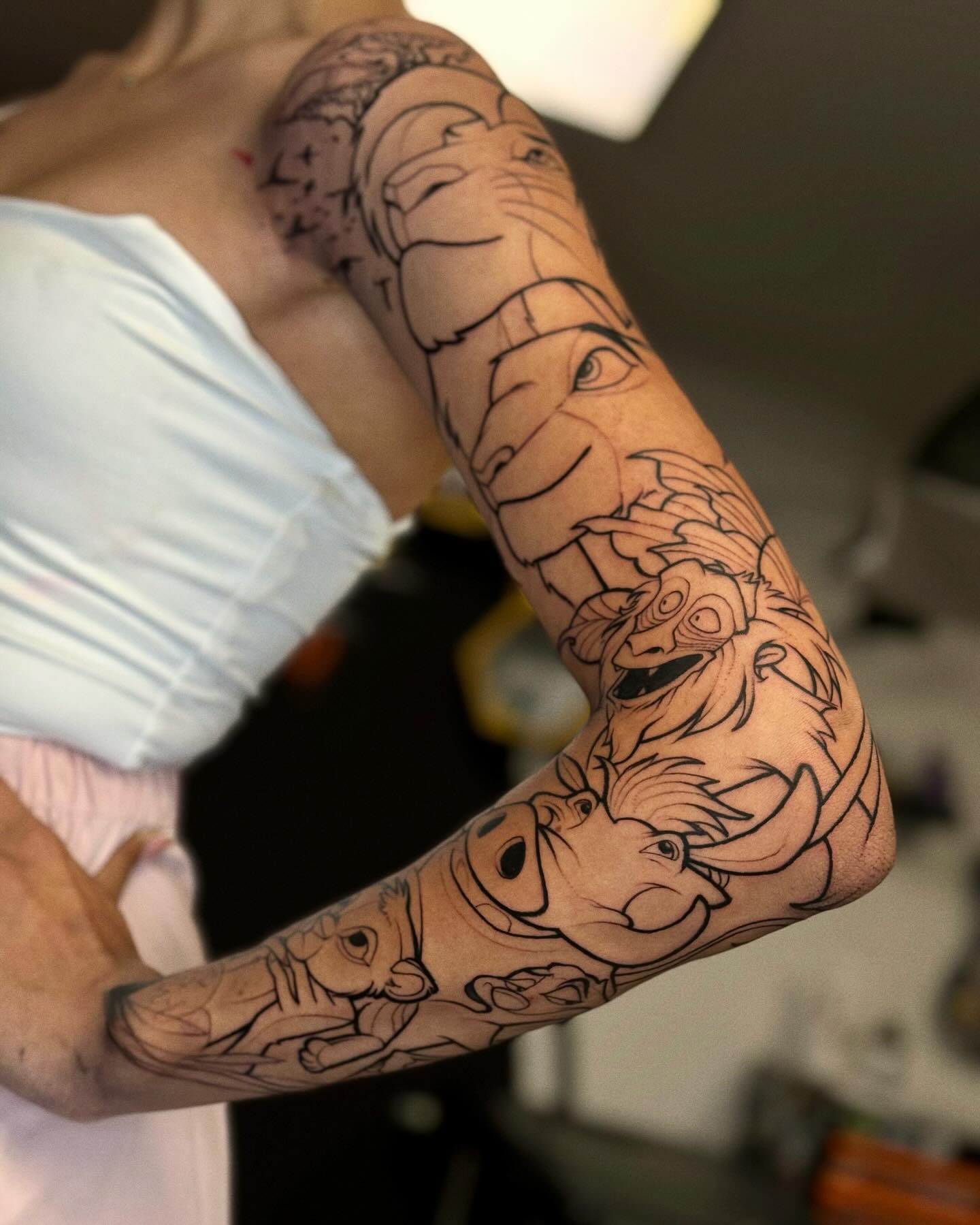 The tattoo features iconic lion characters depicted in sharp, bold line art, showcasing their distinct facial expressions.