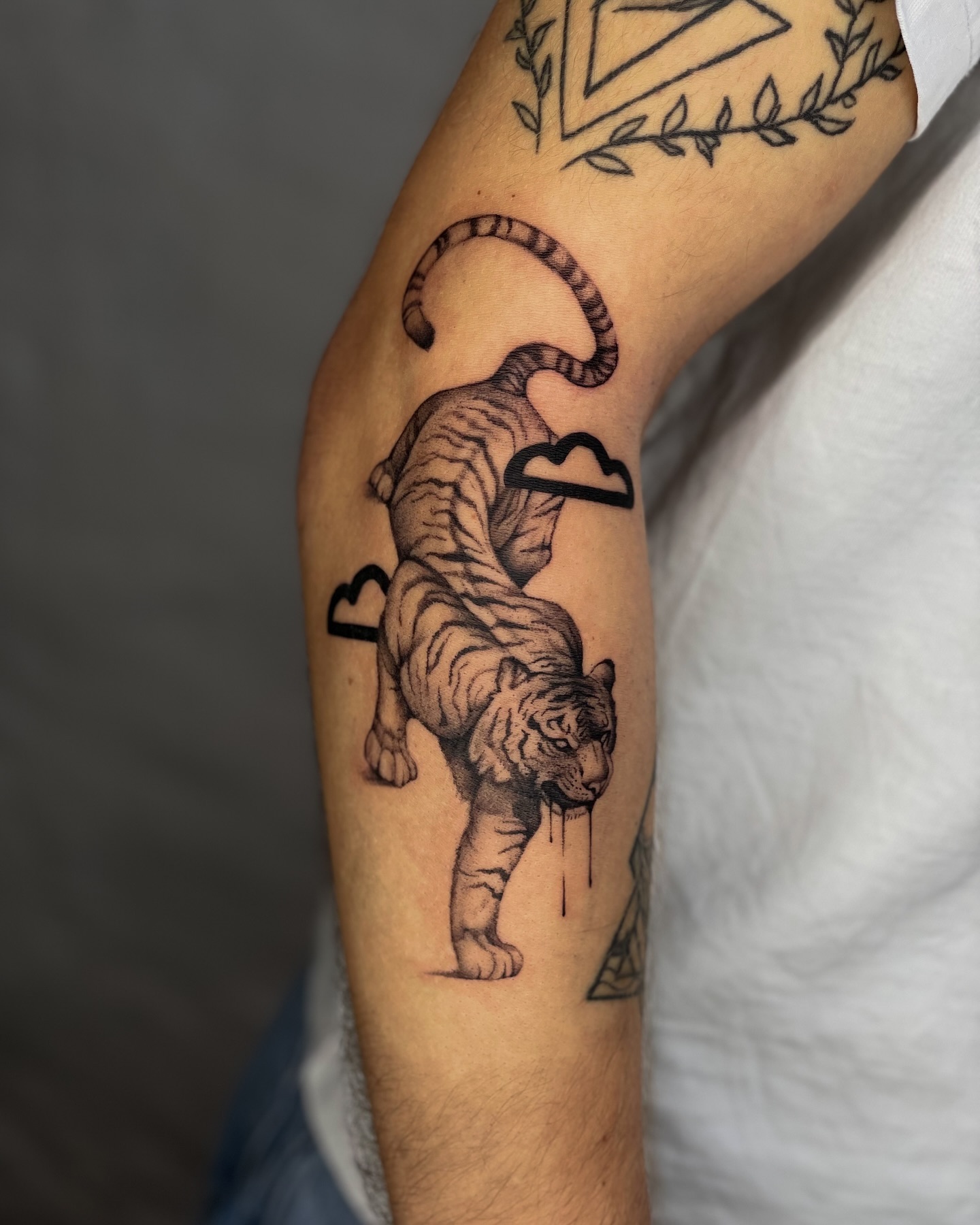 The artist skillfully combines the tiger’s realism with stylized cloud elements, creating a unique contrast that enhances the overall design.