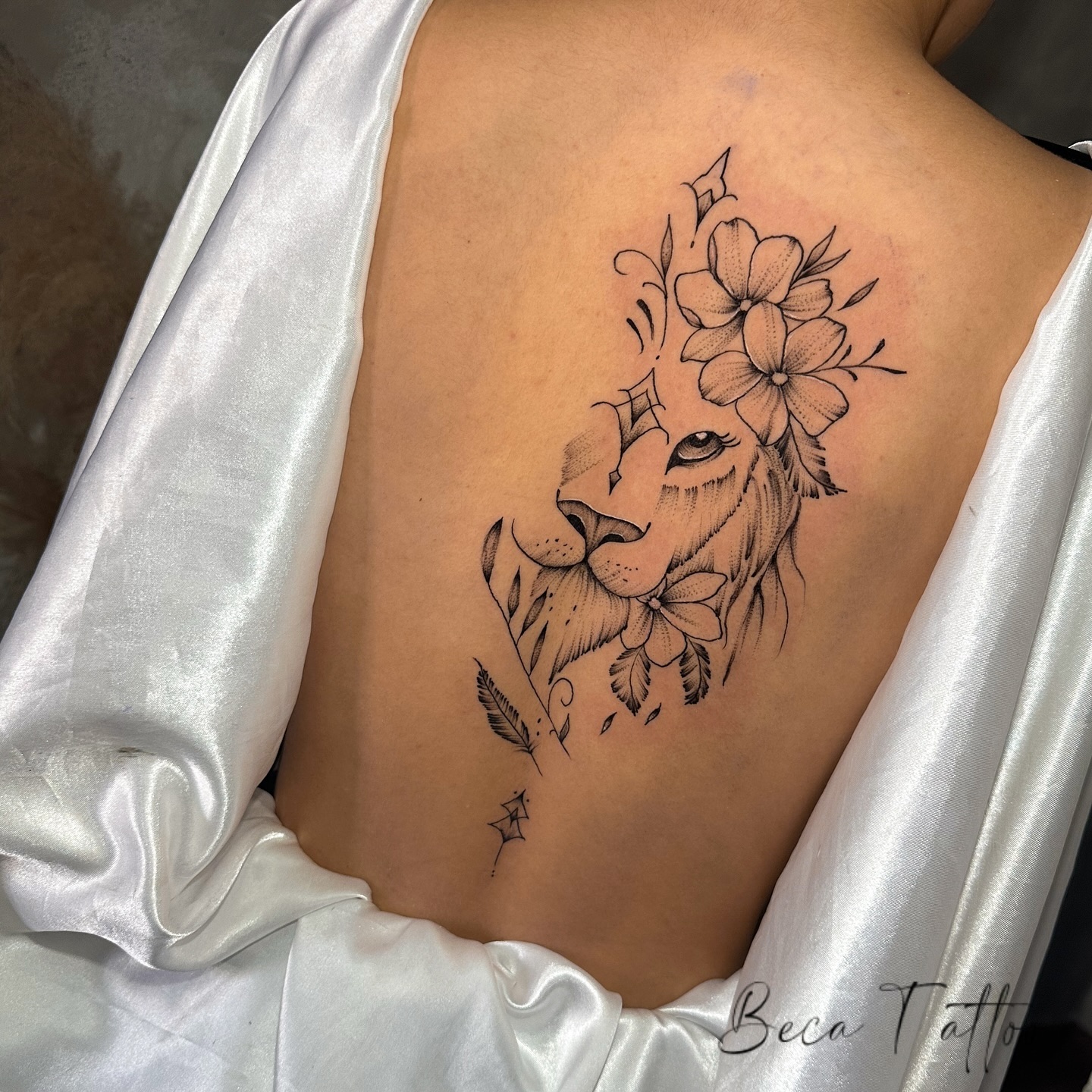 The combination of fine lines for the lion’s fur and the soft curves of the petals showcases a blend of strength and beauty in the design.