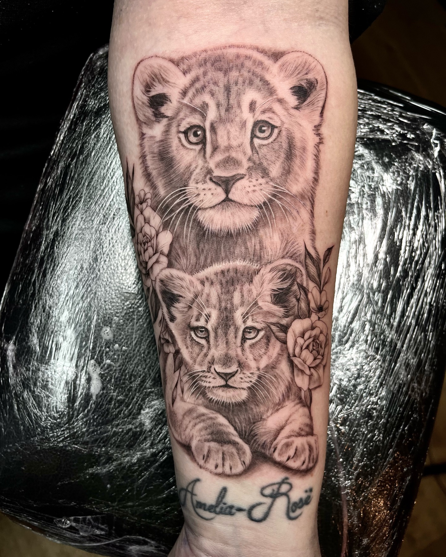 The tattoo features two lion cubs, one resting in front of the other, surrounded by intricate floral designs.