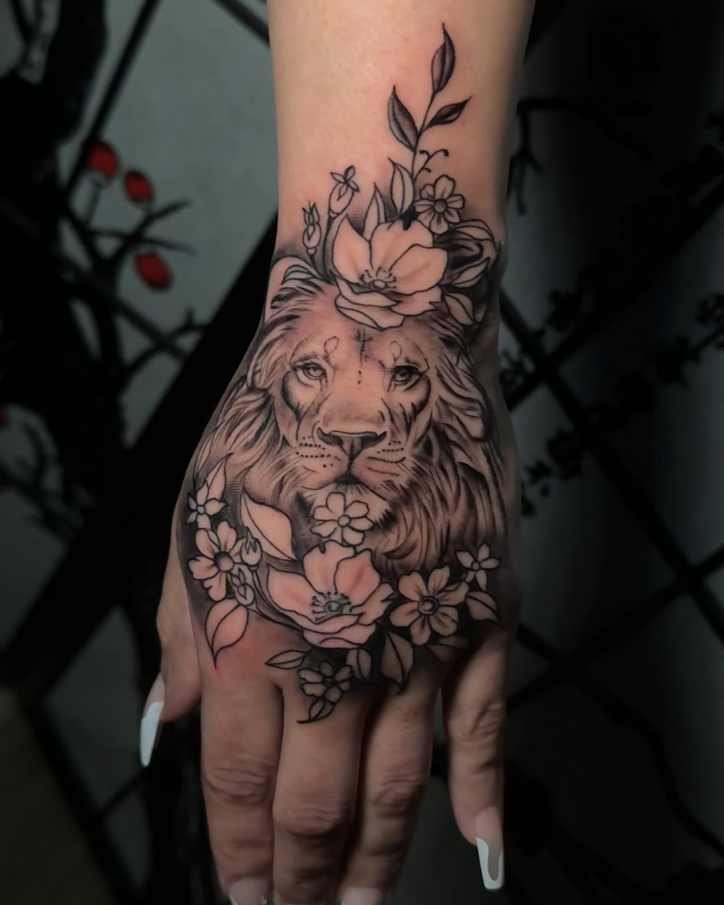 The tattoo features a detailed lion head adorned with delicate flowers that create a striking contrast.