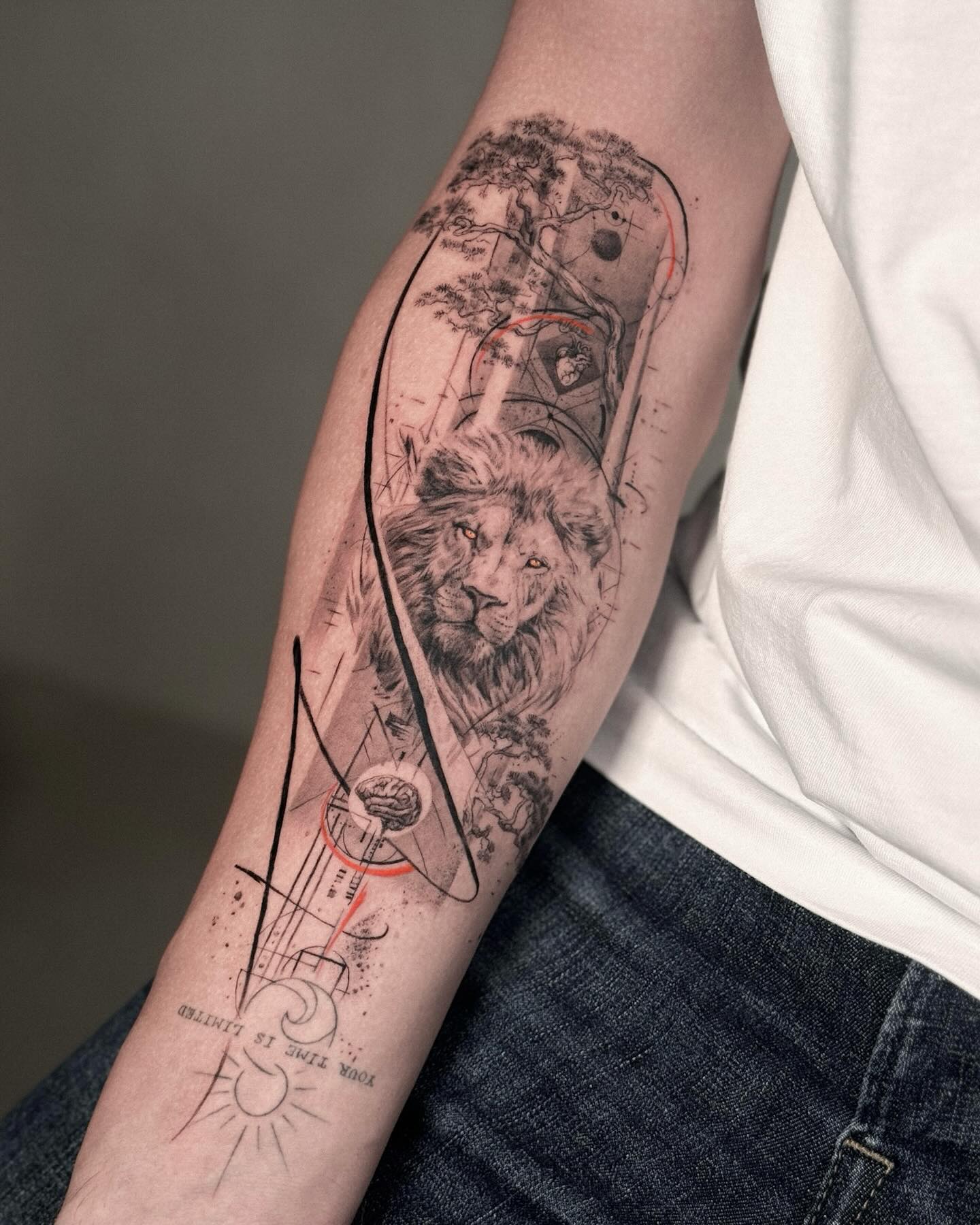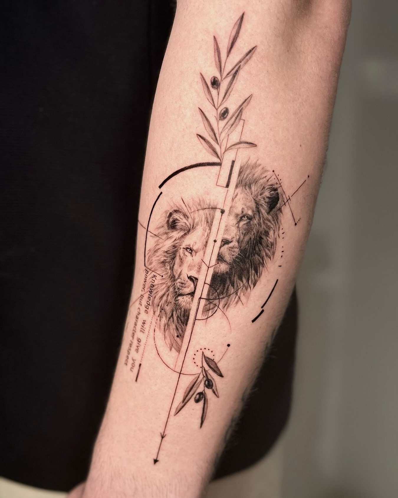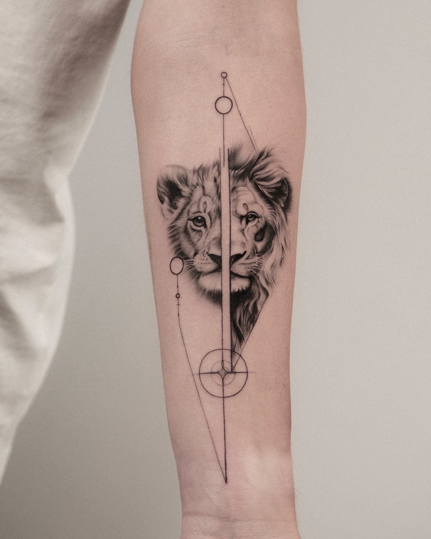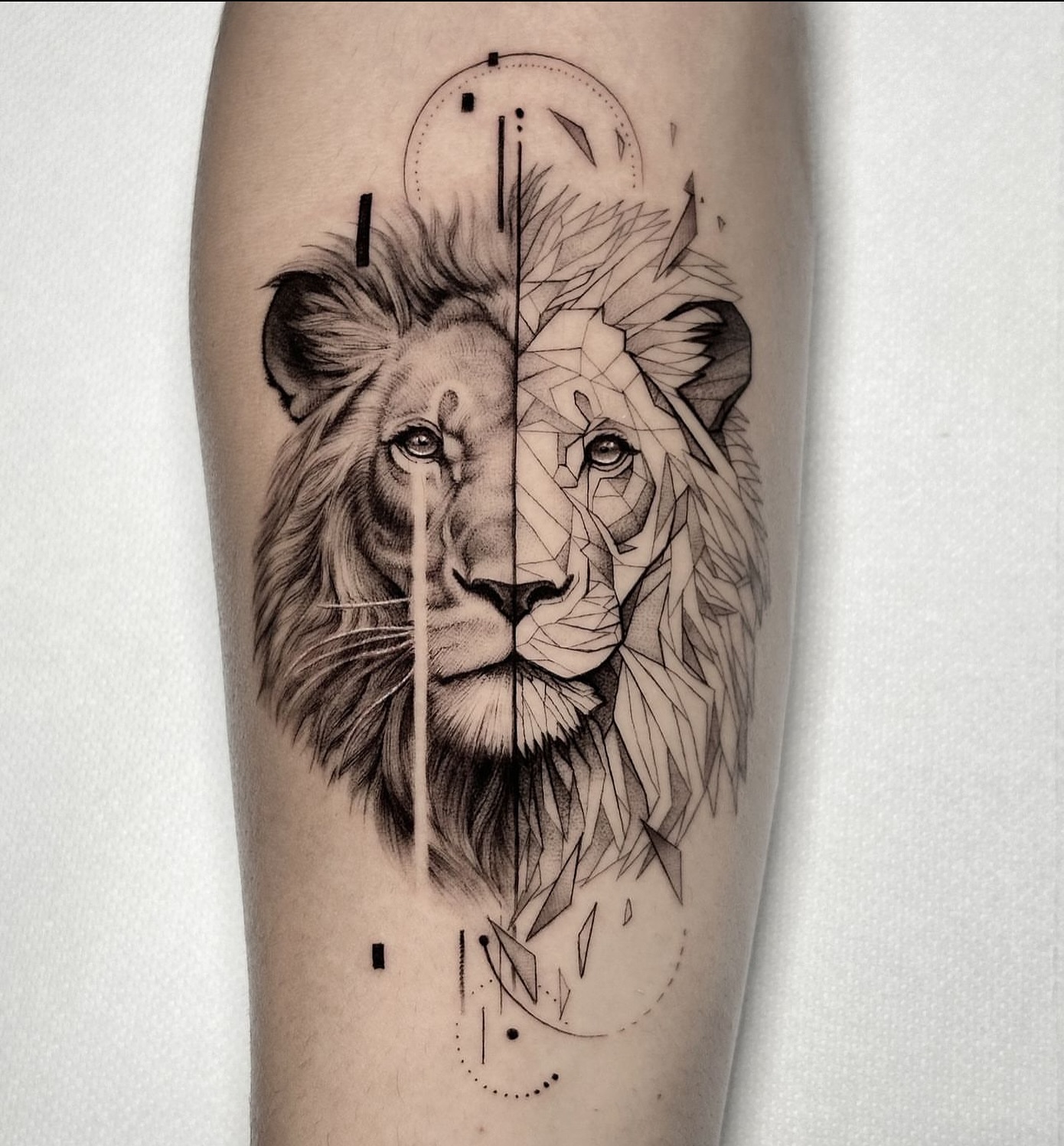 The tattoo features a striking combination of a realistic lion’s face and geometric shapes, creating a unique visual contrast.