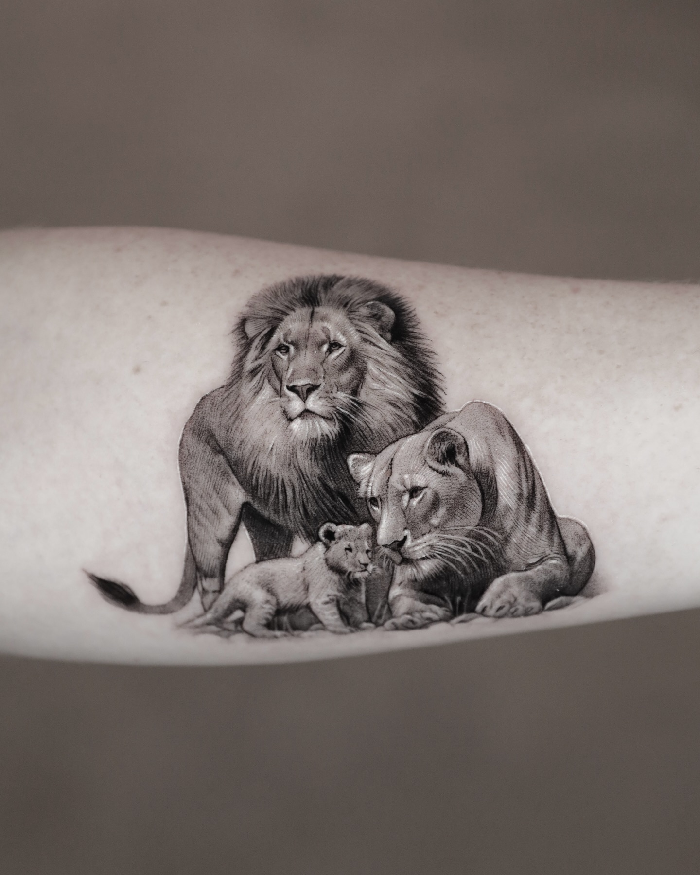 The tattoo features a detailed depiction of a lion, lioness, and their cub, showcasing their strong family bond.