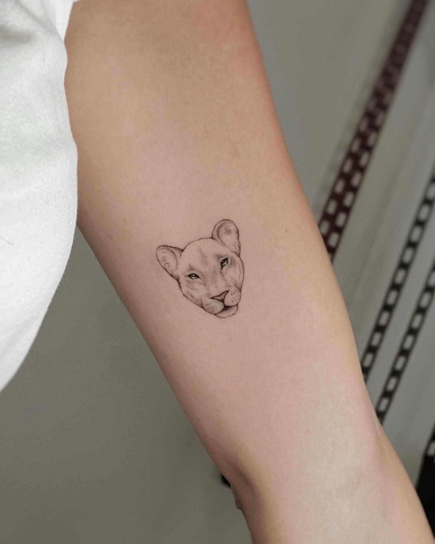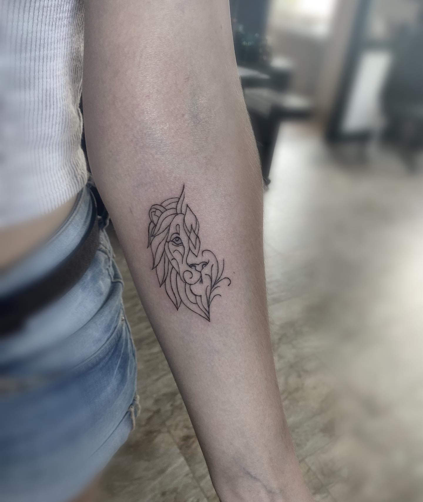 The tattoo features a minimalist lion’s face, defined by smooth, flowing lines that emphasize its mane.