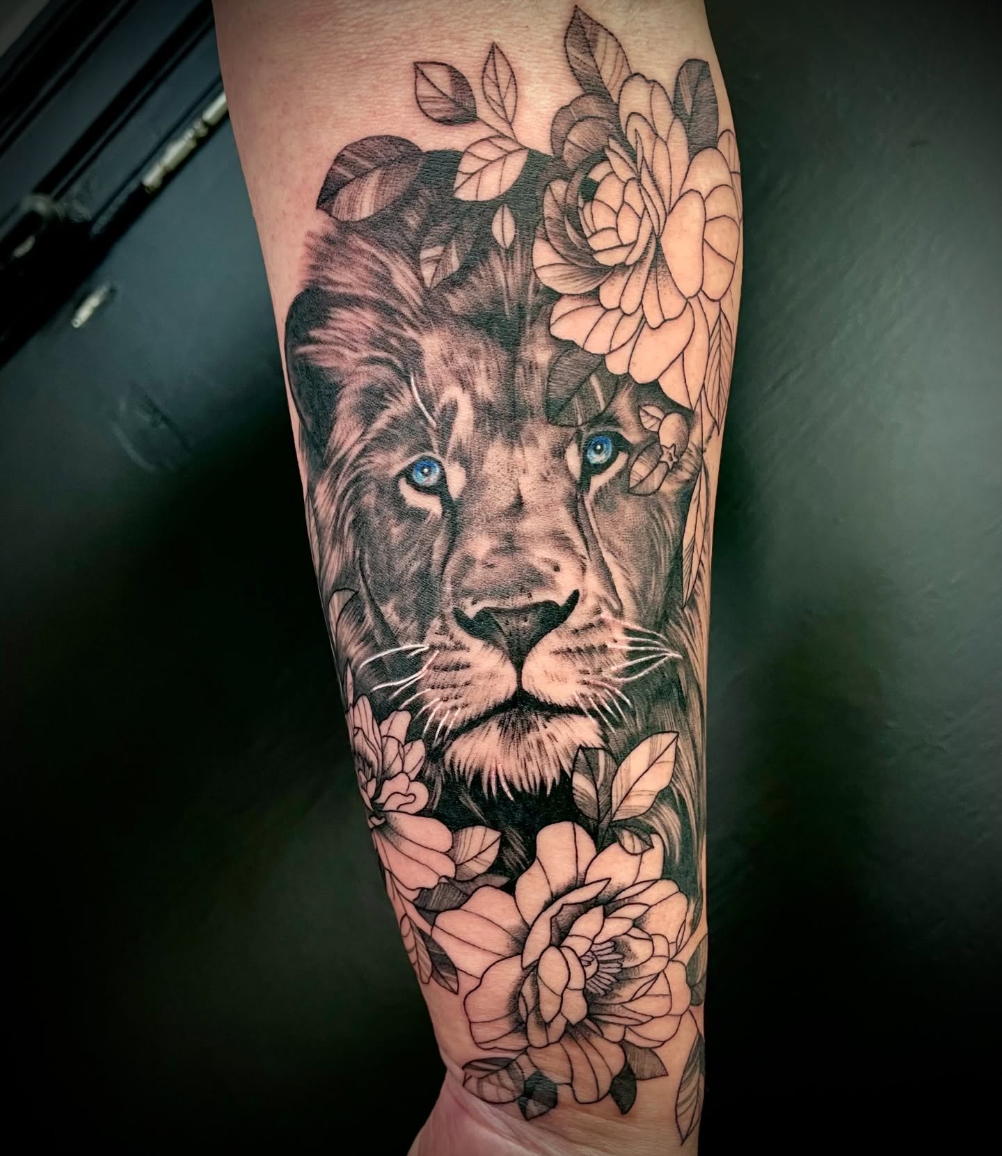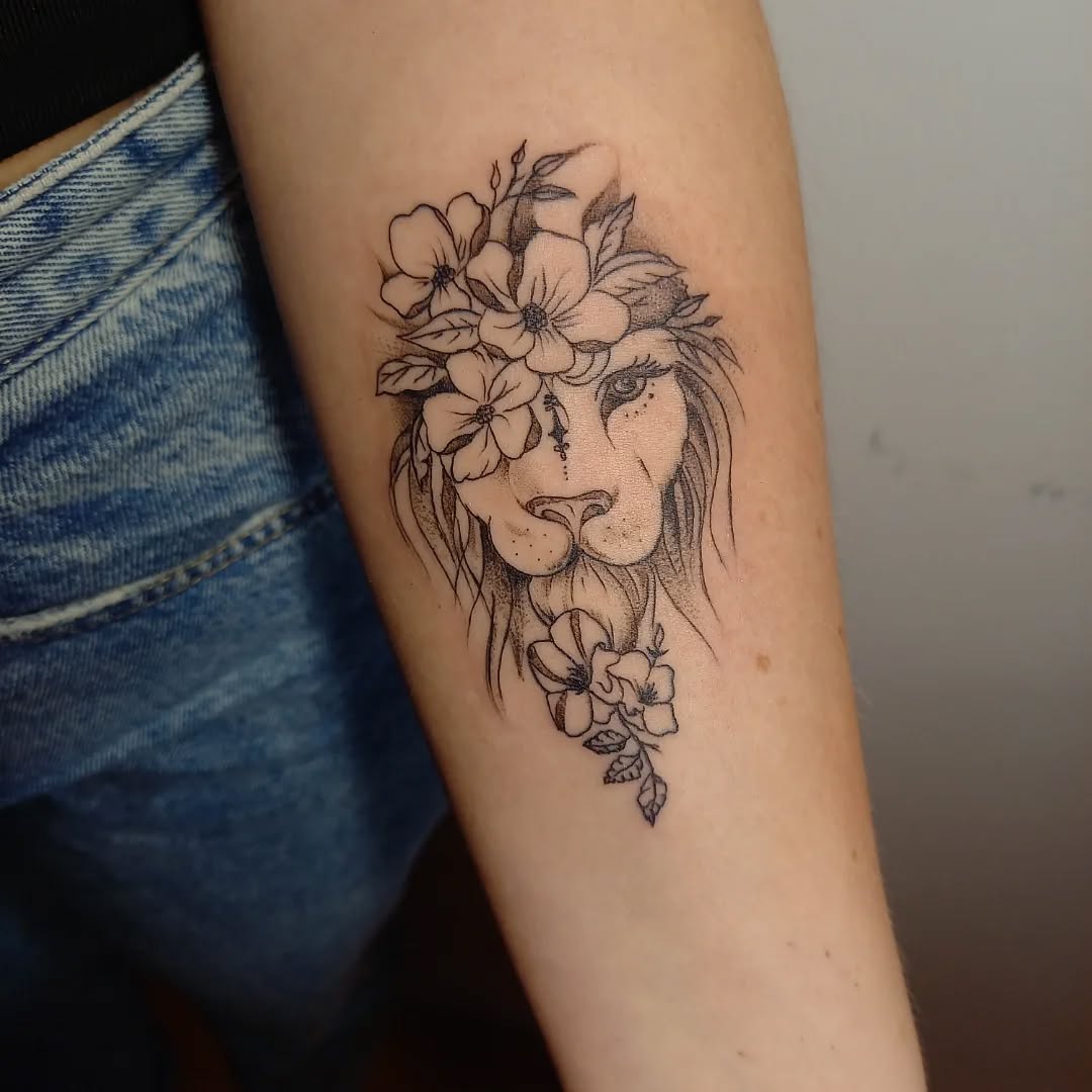 The tattoo features a detailed lion’s face, elegantly intertwined with delicate flowers.