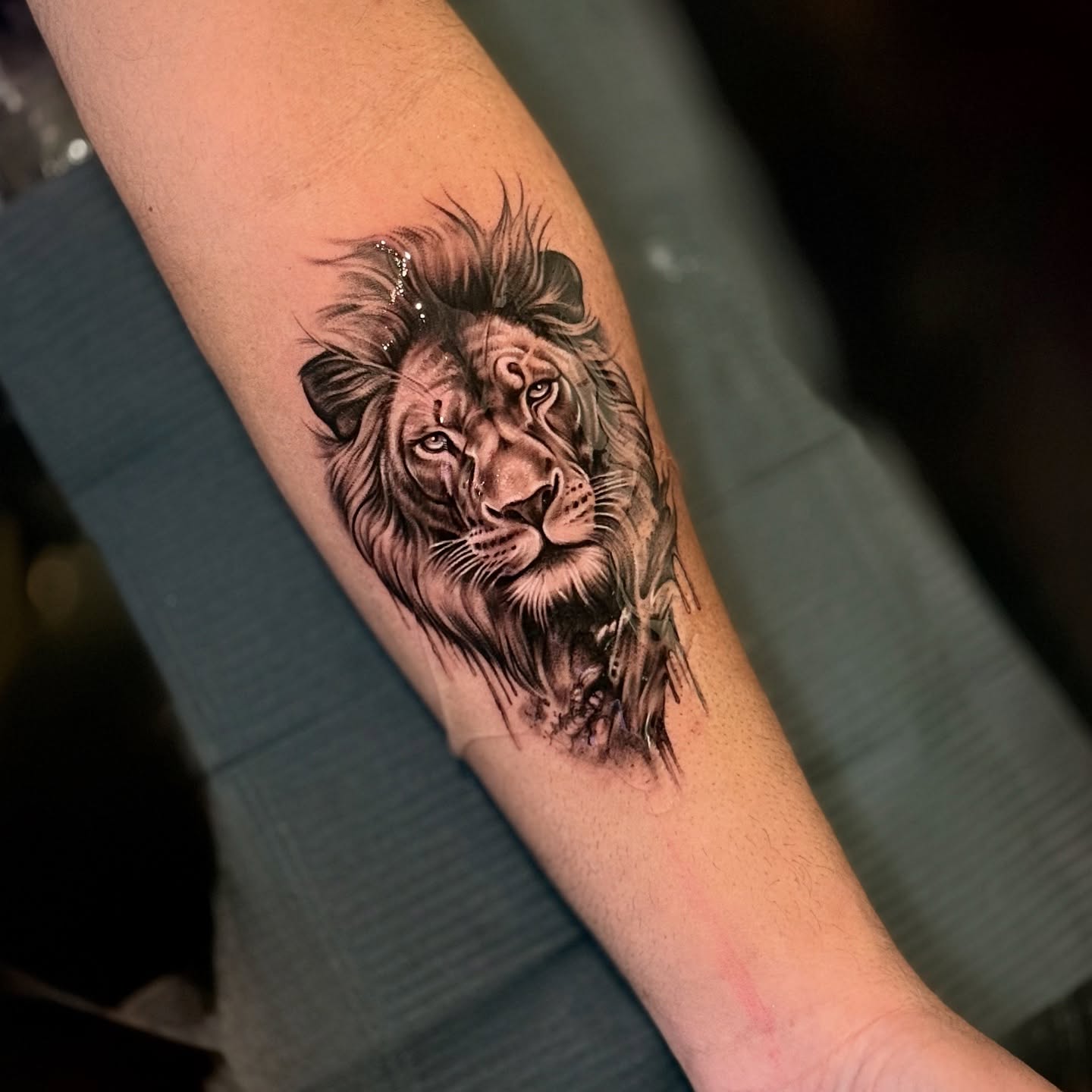 The tattoo features a detailed lion’s face, showcasing intricate line work and shading that highlight its majestic mane and piercing eyes.