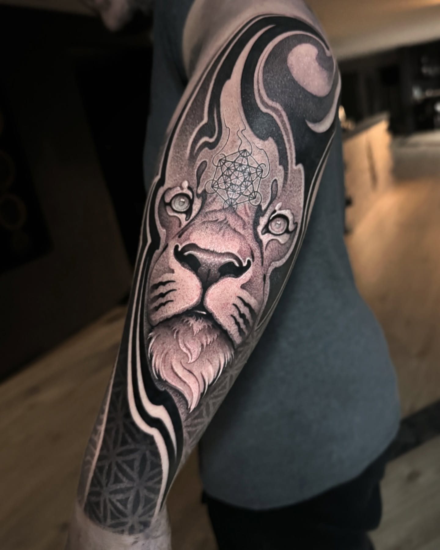 The tattoo features a detailed lion’s face combined with geometric shapes that create a striking contrast.
