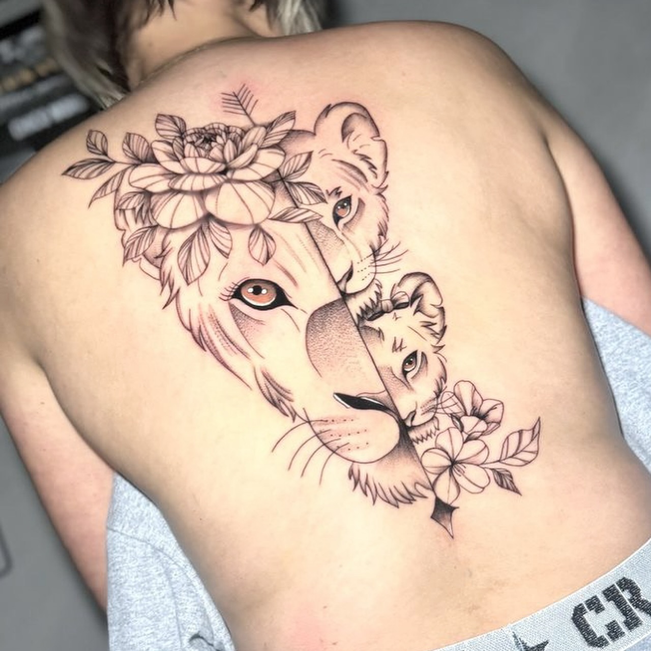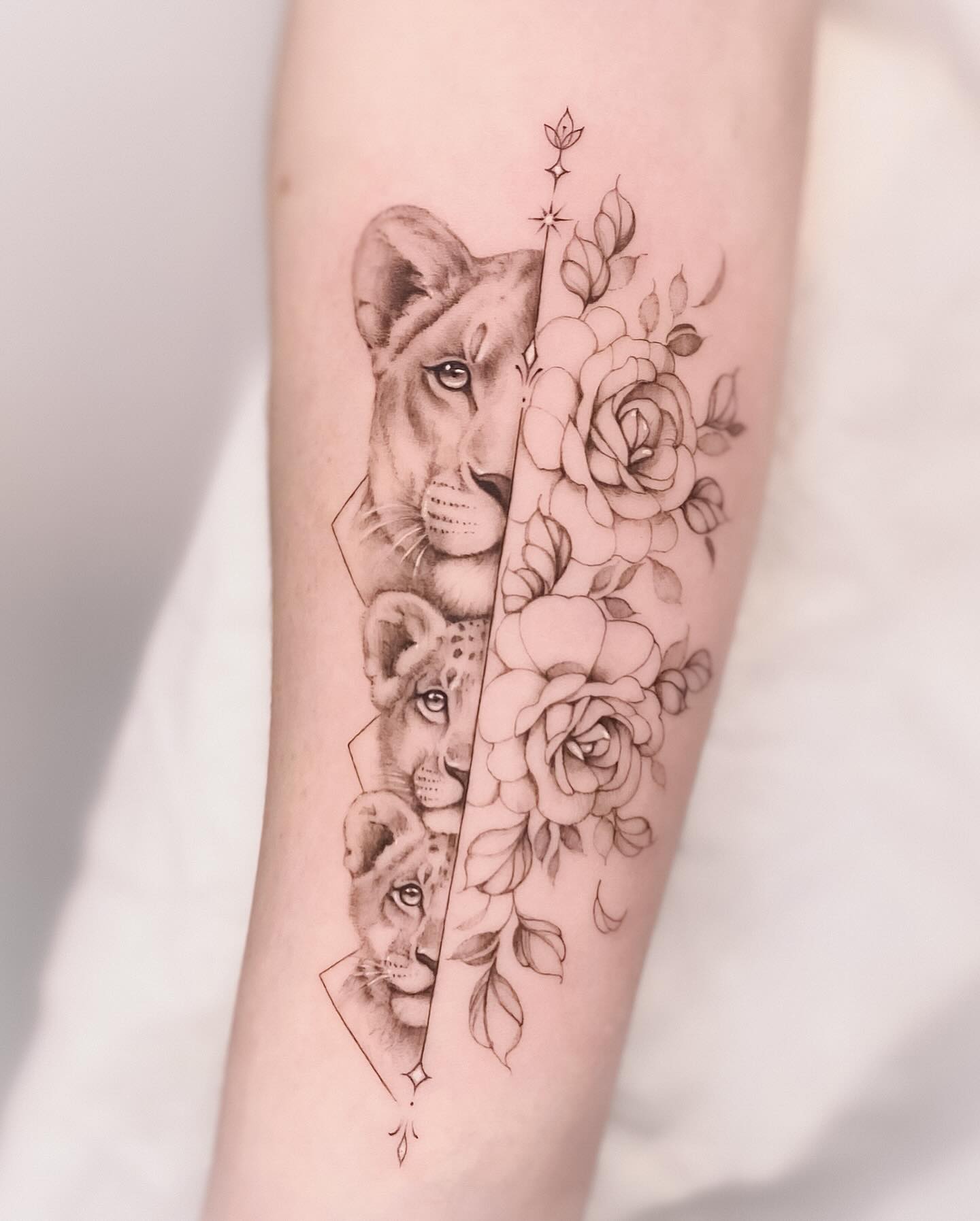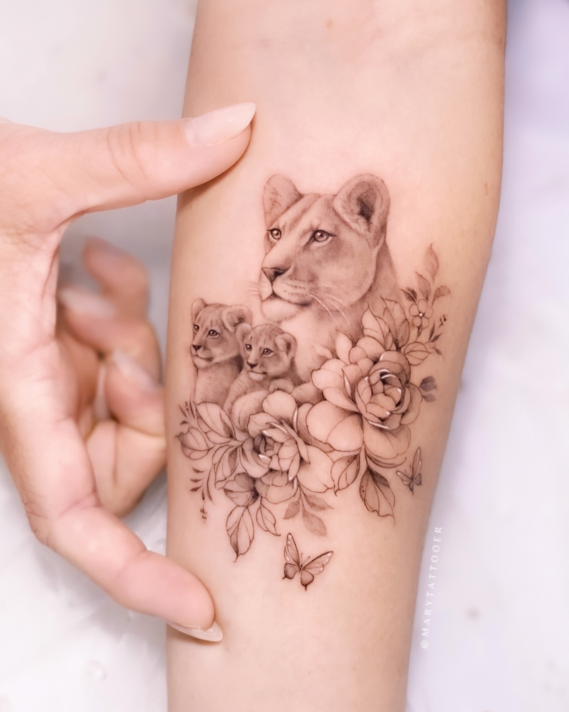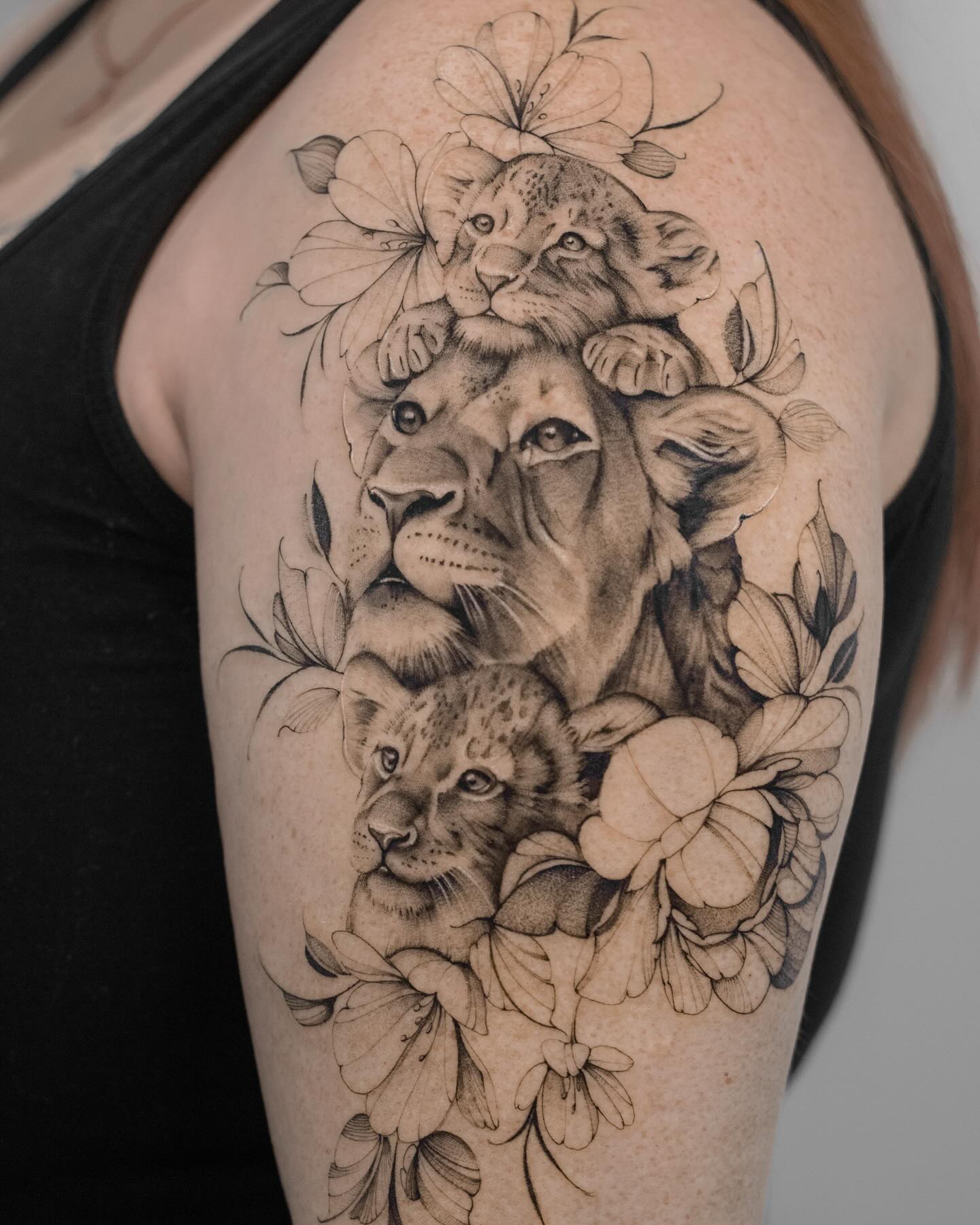 The tattoo showcases a lioness and her cubs, intricately surrounded by delicate flowers.