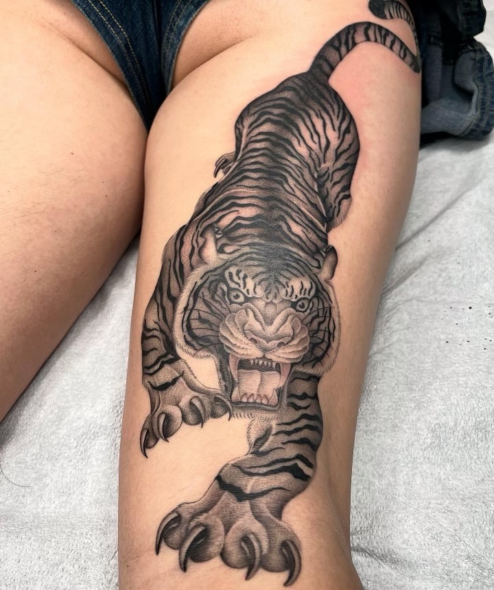 The tattoo features a striking depiction of a tiger poised gracefully, with its body intricately detailed and its face capturing a fierce expression.