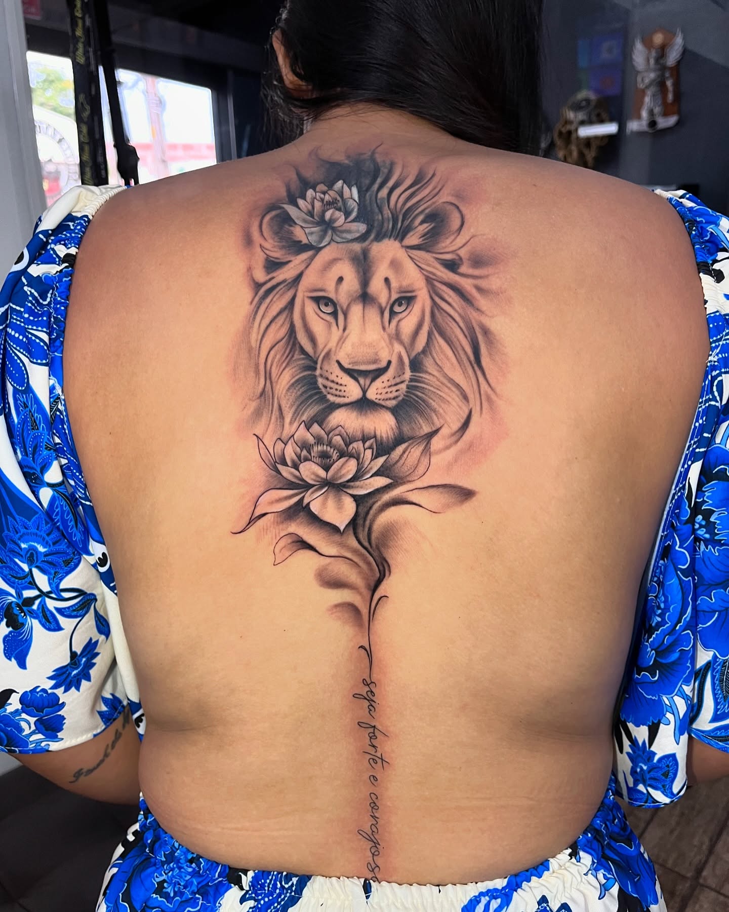 The tattoo features a lion’s head intricately detailed with a flowing mane and serene expression, complemented by a blooming lotus flower at the top.