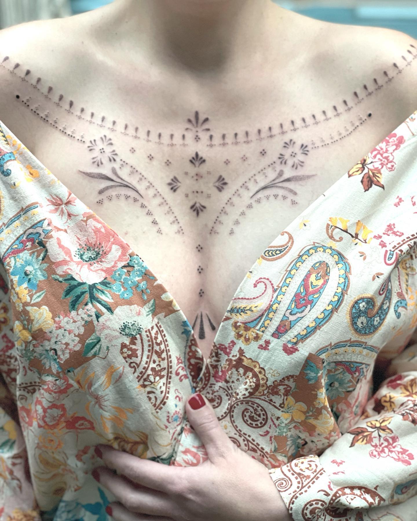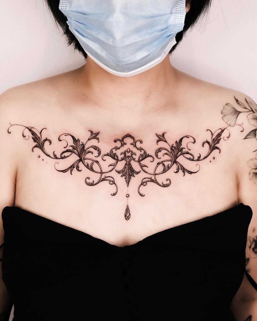 This image showcases a stunning chest tattoo adorned with intricate floral patterns that flow beautifully across the skin. The delicate lines and shapes create an eye-catching contrast against the soft fabric of the blouse. For those considering a chest tattoo, choosing a design that reflects personal style can make it truly special.