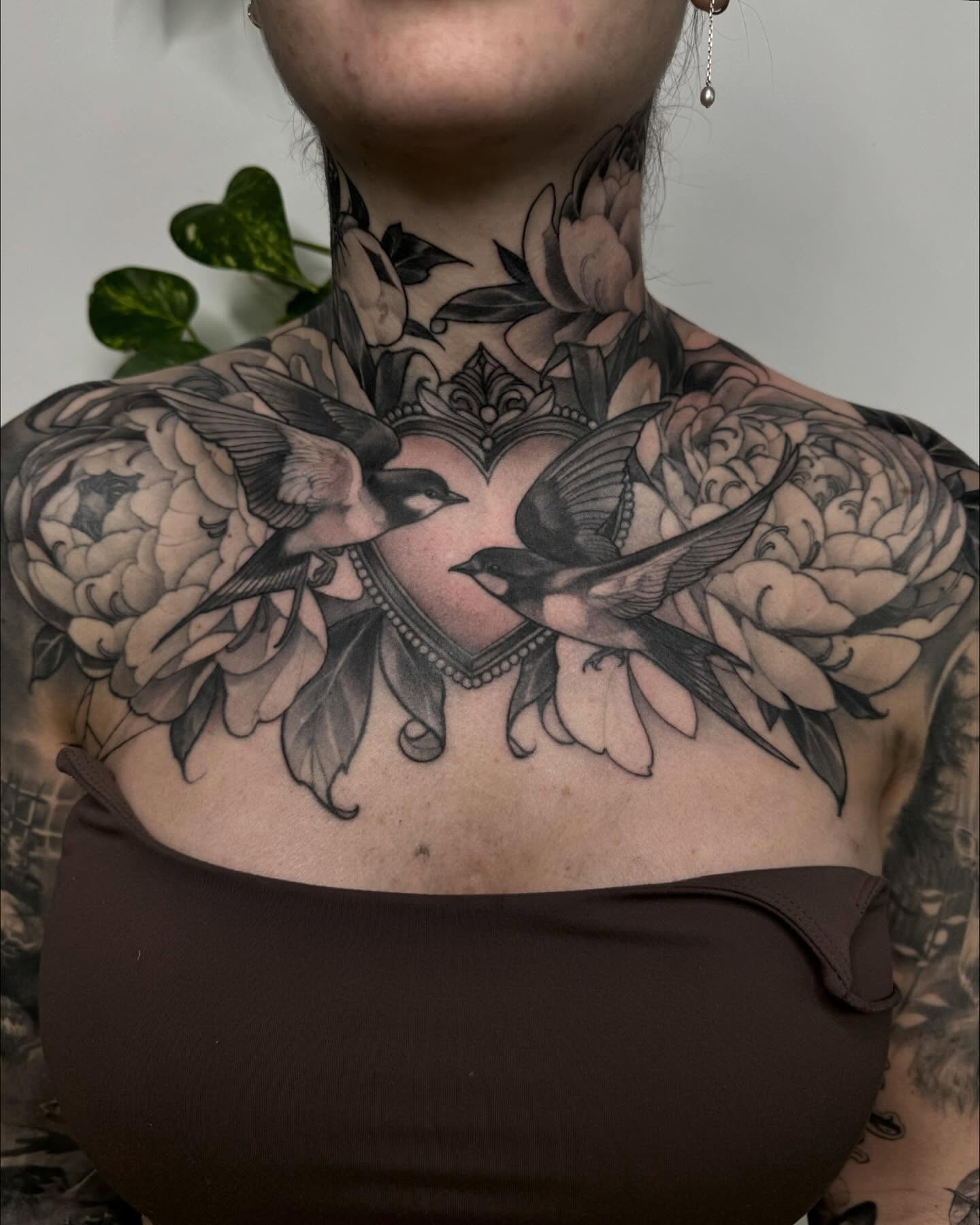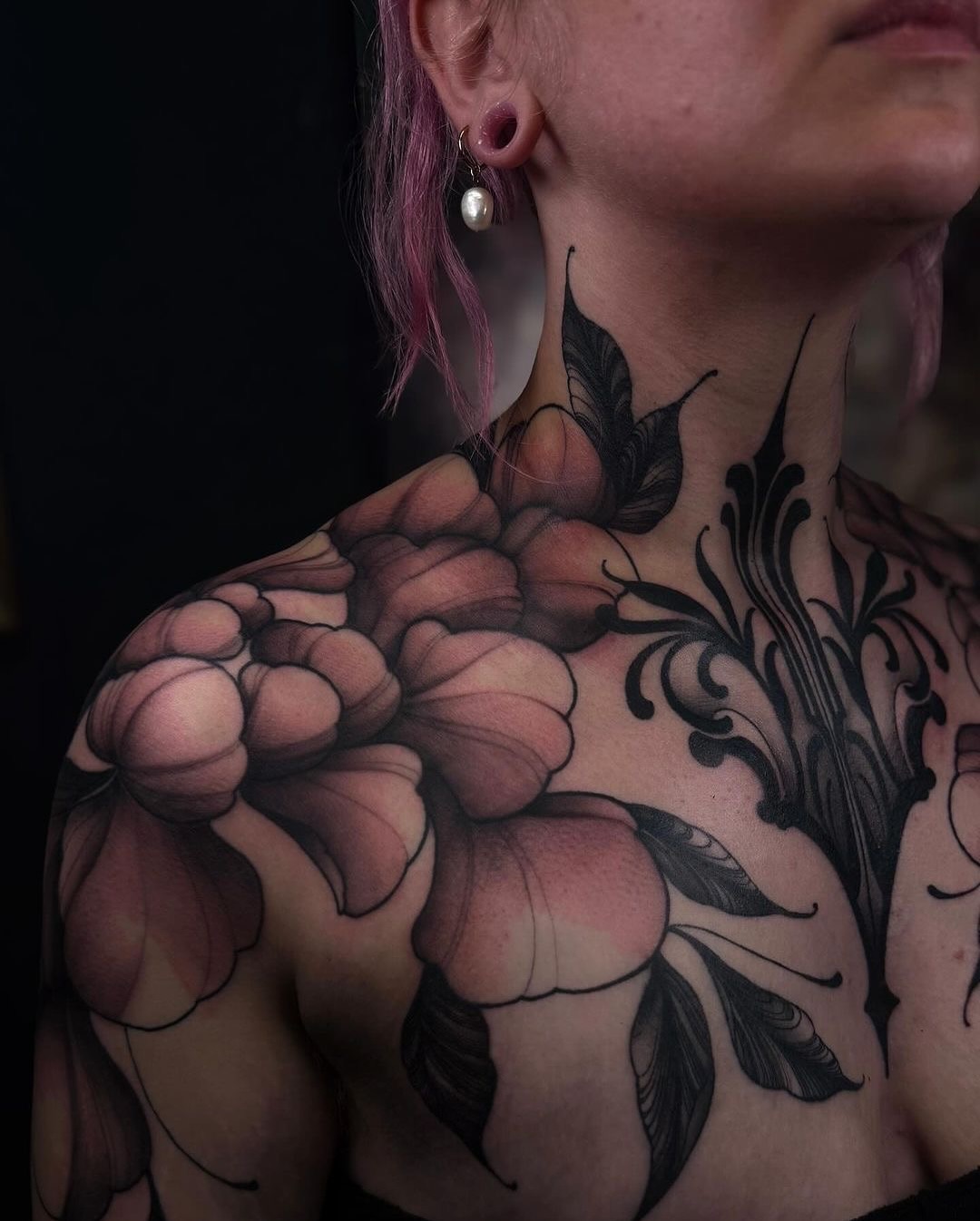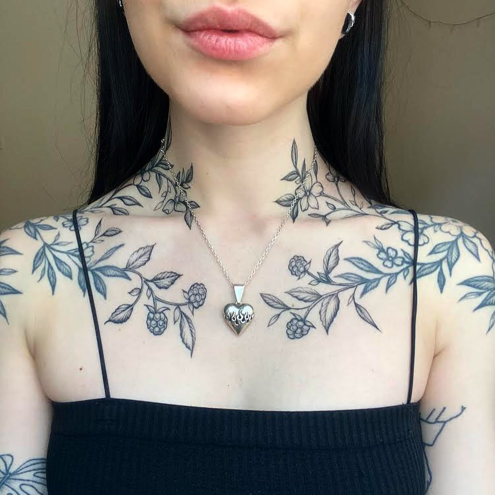 This image showcases a stunning display of intricate floral tattoos that beautifully cover the chest and neck area. Each design tells a story, blending elegance with a bold sense of individuality. For those considering similar body art, choosing a design that resonates personally can make it even more meaningful.