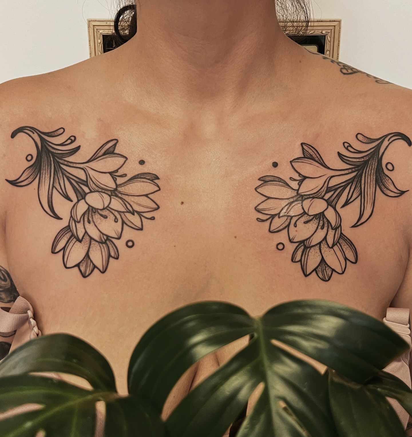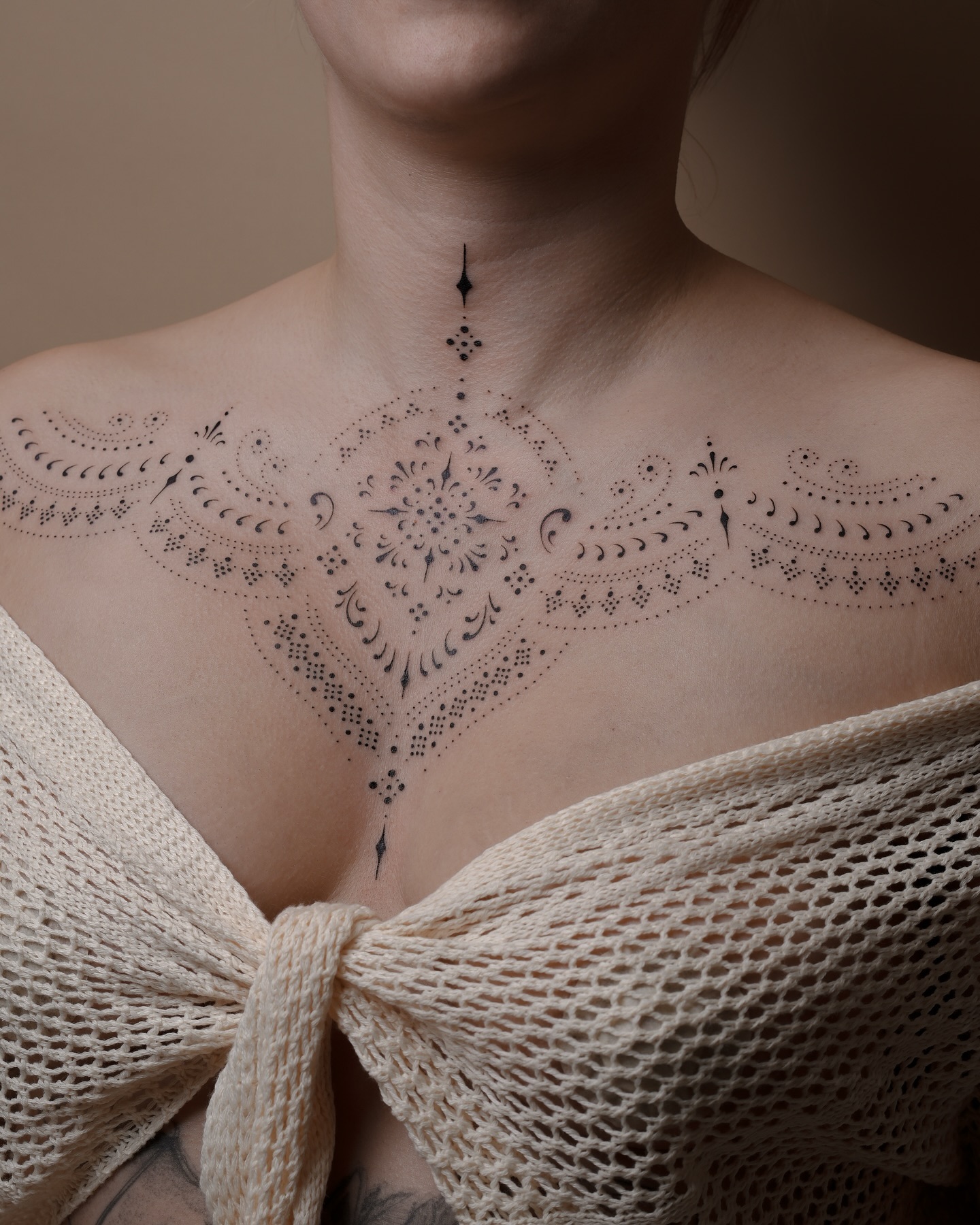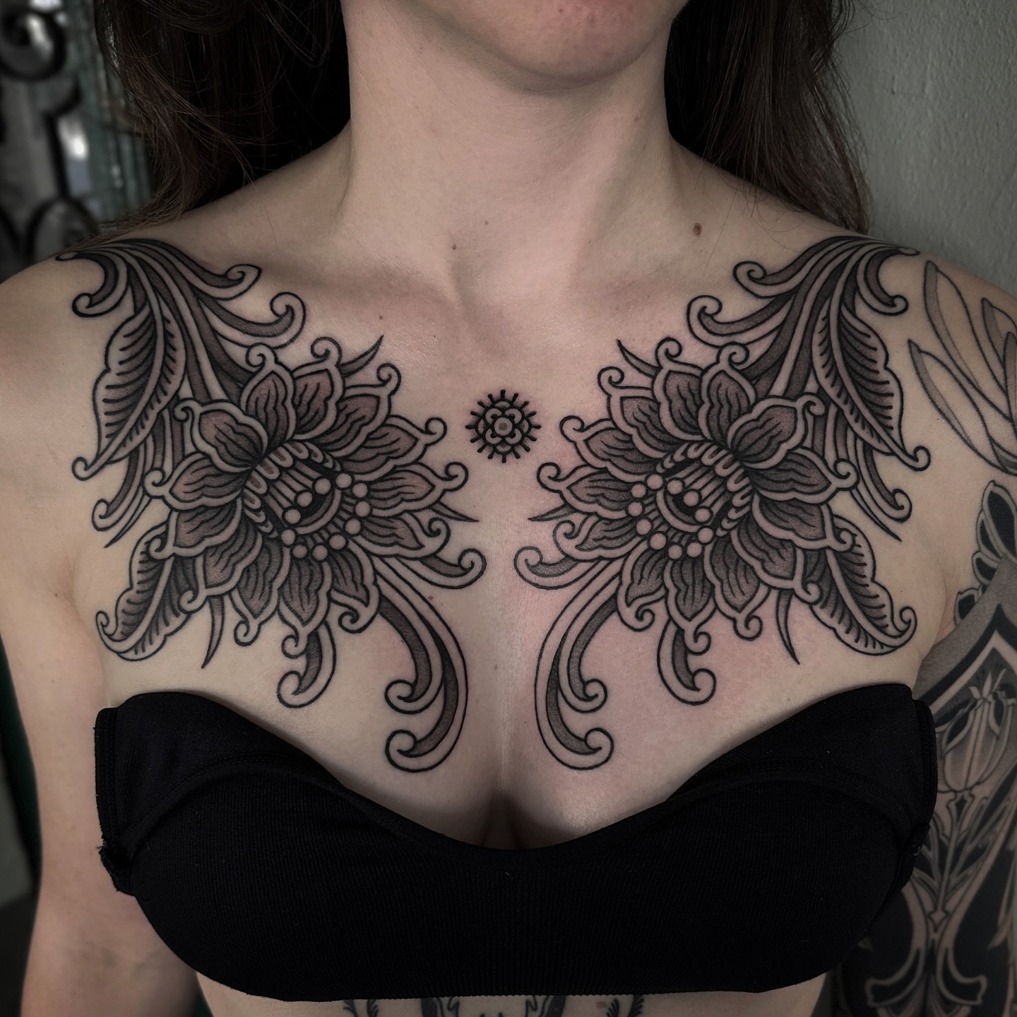 This image showcases a stunning chest tattoo that beautifully blends intricate floral patterns with delicate dot work. The design flows gracefully across the skin, creating a captivating focal point that draws the eye. For anyone considering a similar piece, it’s essential to choose a design that reflects personal style and meaning.