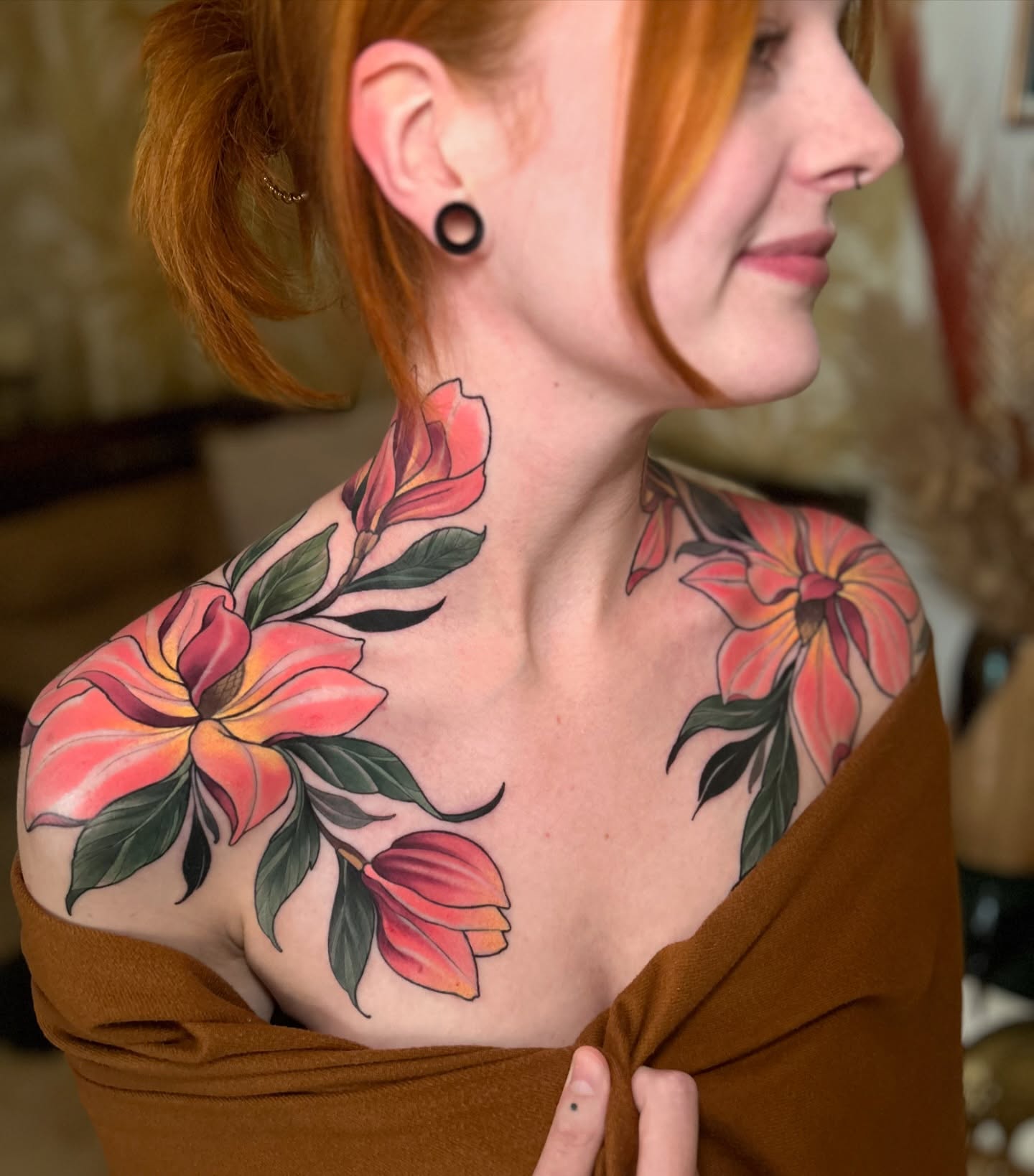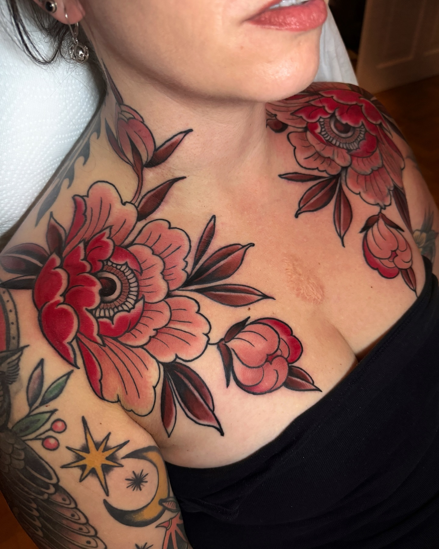 This image showcases a beautiful display of floral tattoos that gracefully adorn a woman’s chest and shoulders. The vibrant colors and intricate designs create a stunning visual that highlights personal expression and artistry. Choosing a tattoo that reflects one’s personality can be a memorable journey, making each piece truly unique.