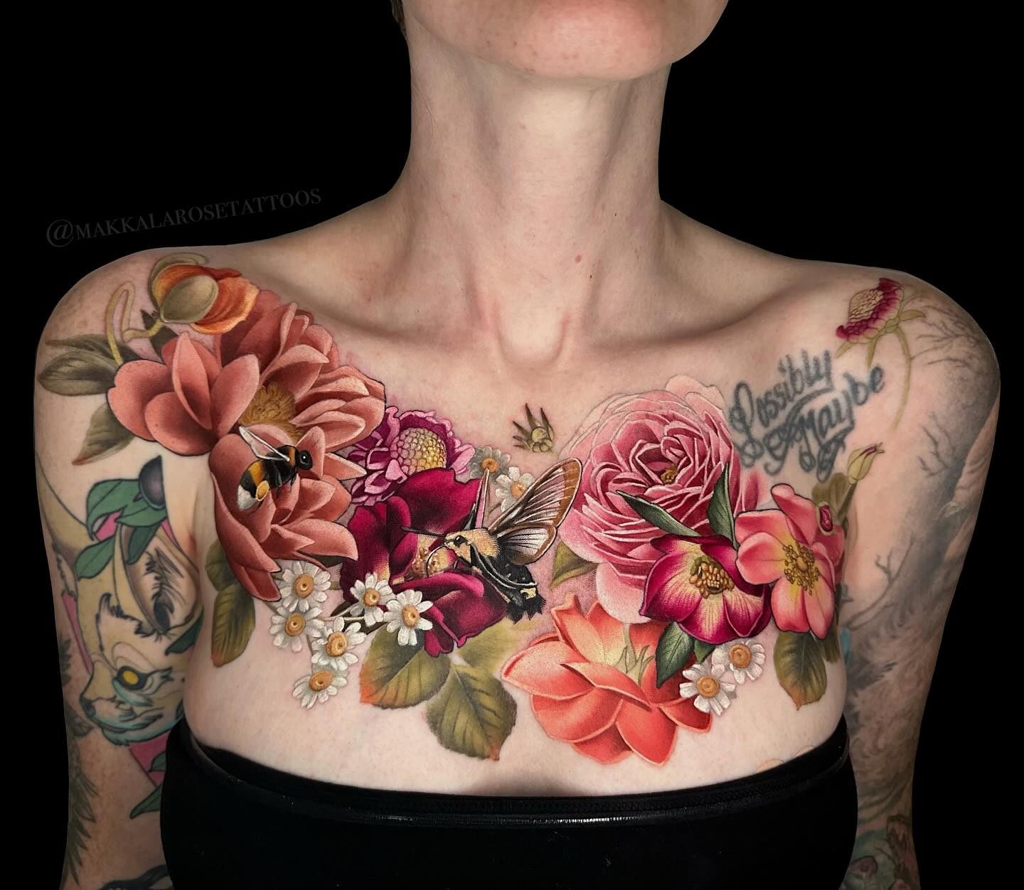 This stunning tattoo features an intricate design of flowers and a bee that beautifully adorns the chest. The combination of nature’s elements creates a vibrant and lively look, making it a unique form of self-expression. For anyone considering a similar piece, choosing a design that speaks to personal values or interests can make the tattoo even more meaningful.