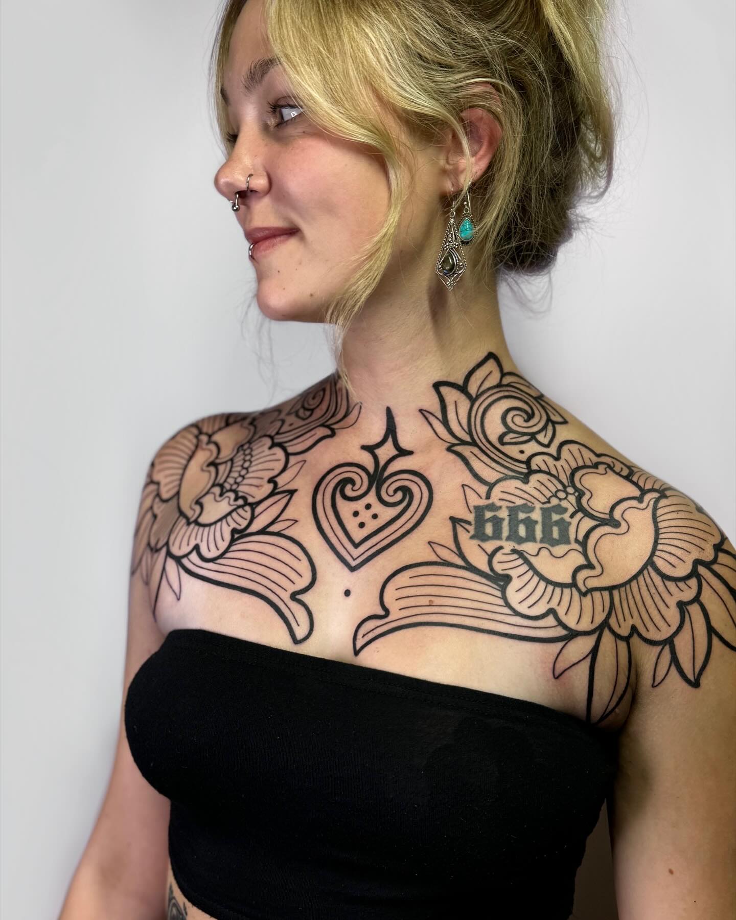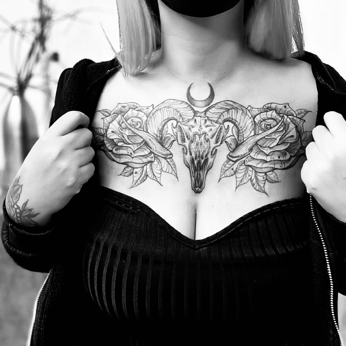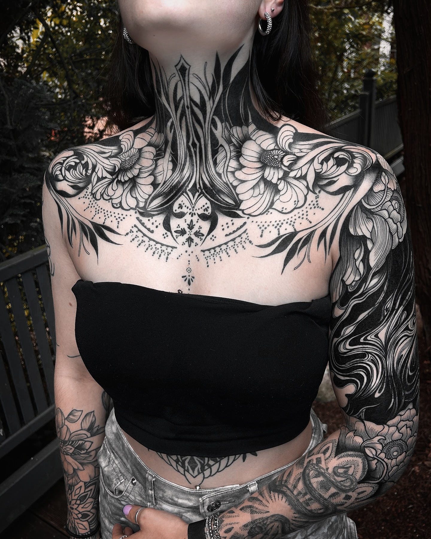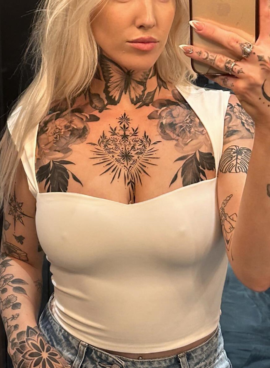 This stunning image showcases a woman proudly displaying her beautiful chest tattoos, featuring intricate floral designs that wrap gracefully around her shoulders. The bold black lines and detailed patterns create an eye-catching statement piece that reflects her unique personality. When considering a chest tattoo, think about designs that resonate with your story, making the art as meaningful as it is visually appealing.