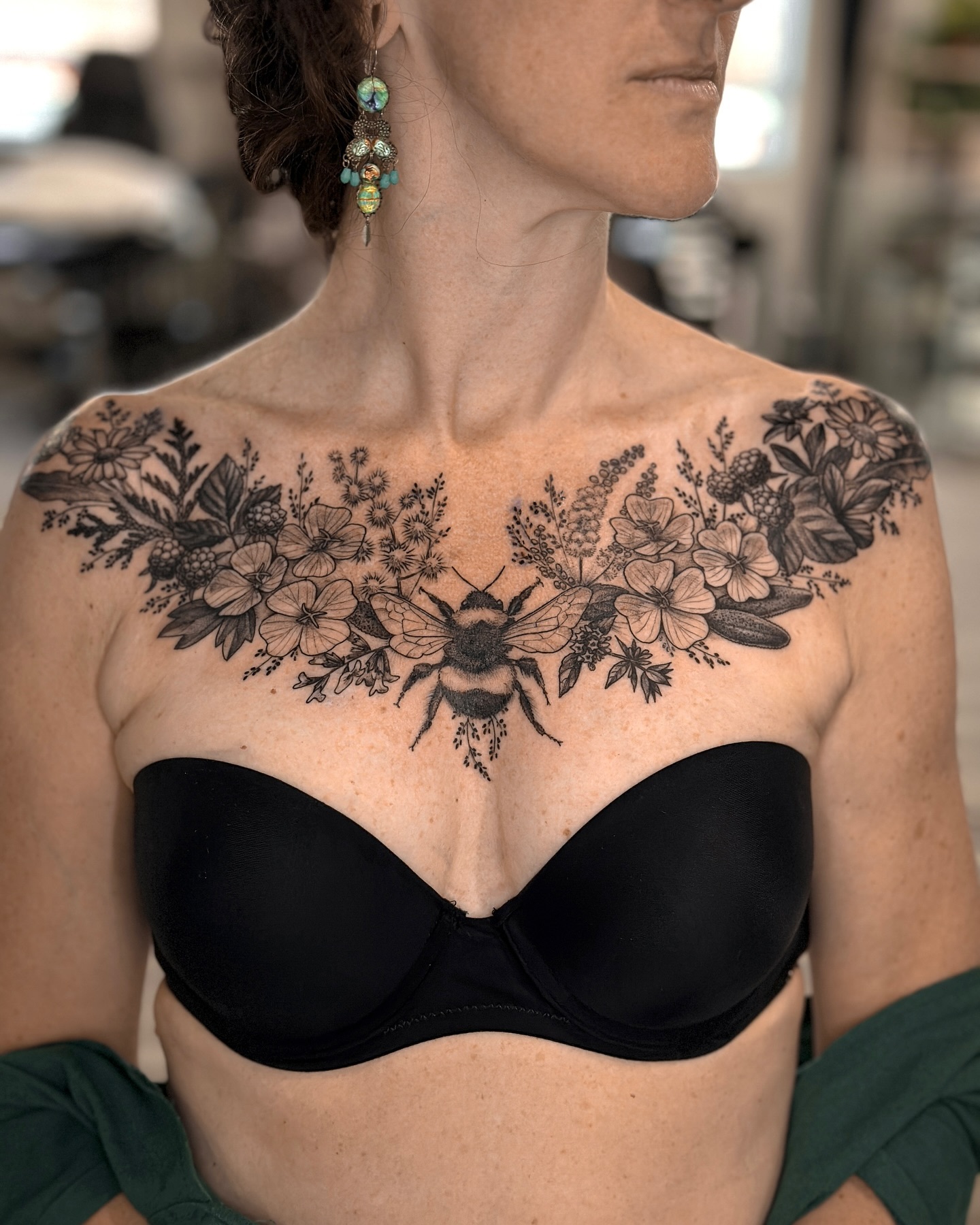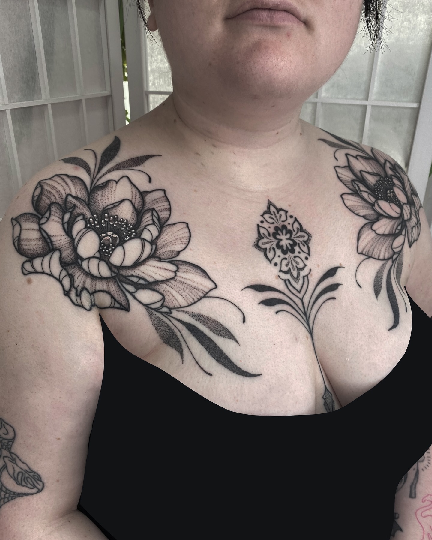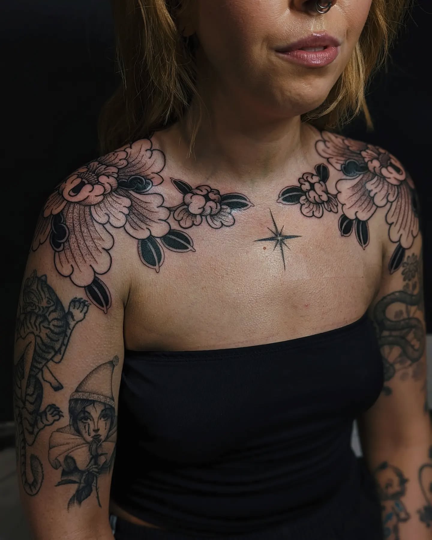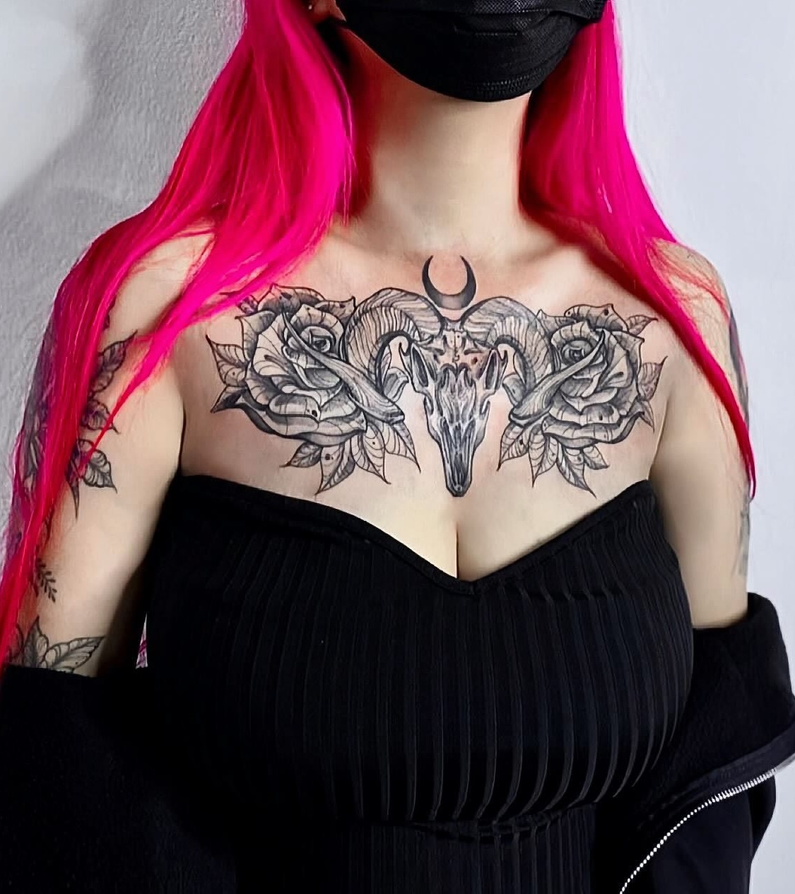 This stunning image showcases a woman proudly displaying her beautiful chest tattoos, featuring intricate floral designs that wrap gracefully around her shoulders. The bold black lines and detailed patterns create an eye-catching statement piece that reflects her unique personality. When considering a chest tattoo, think about designs that resonate with your story, making the art as meaningful as it is visually appealing.