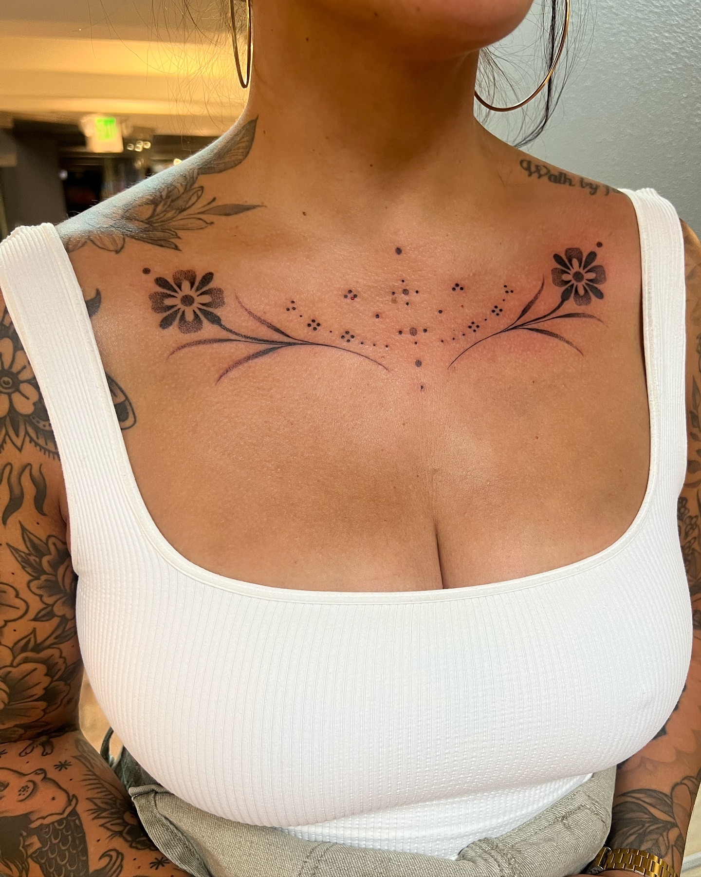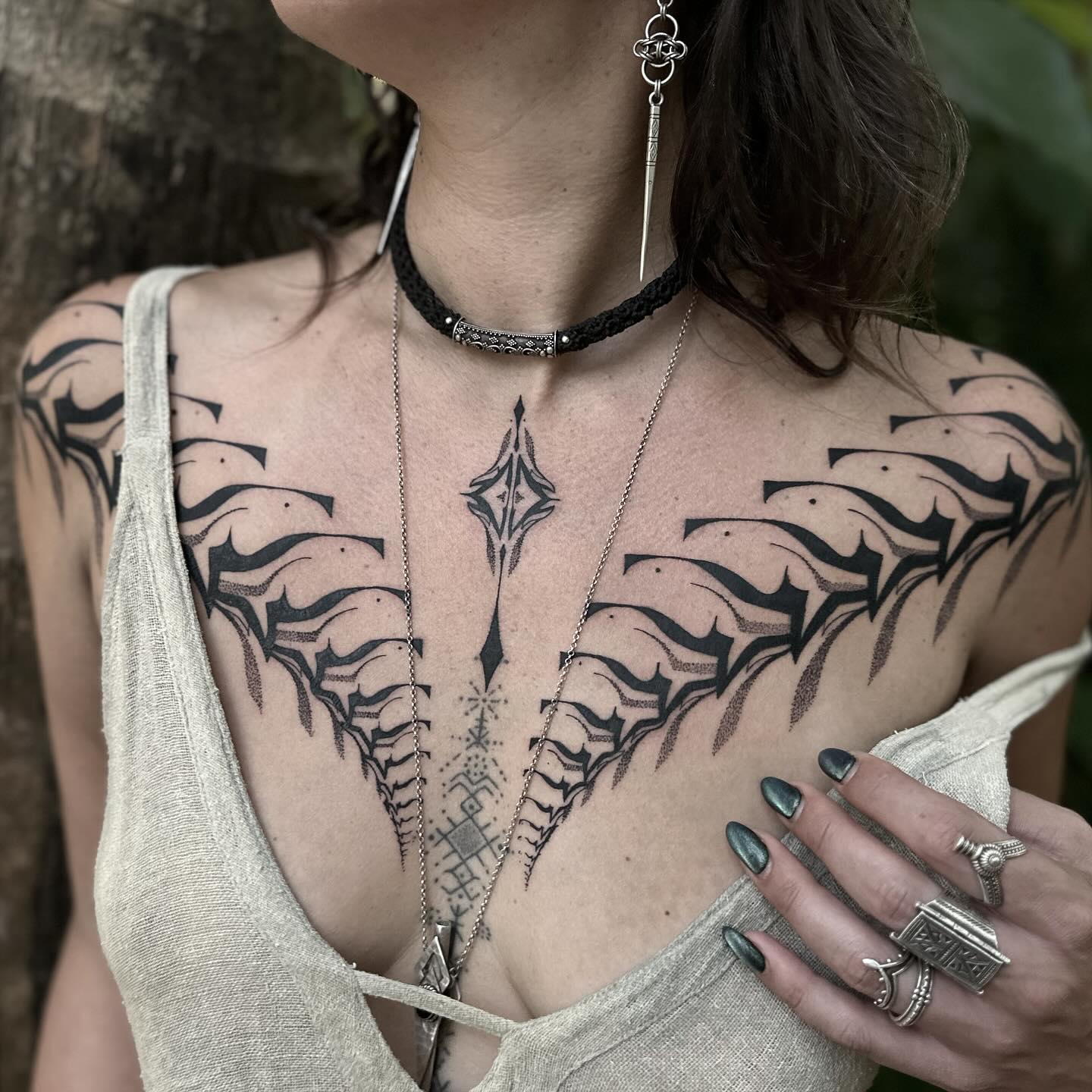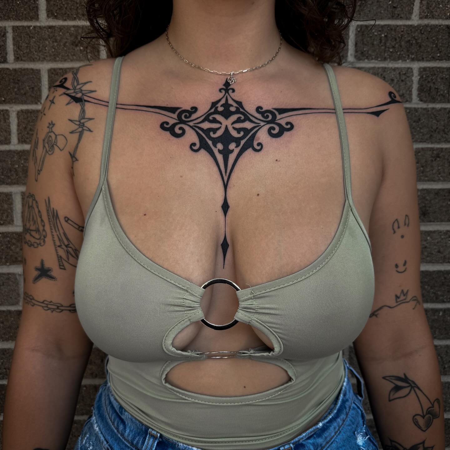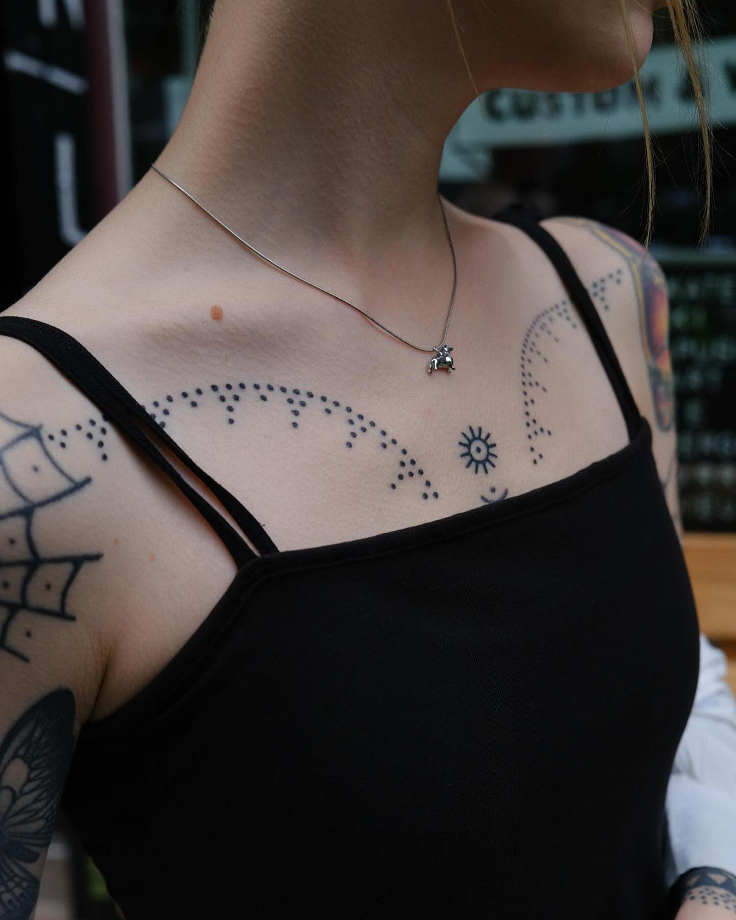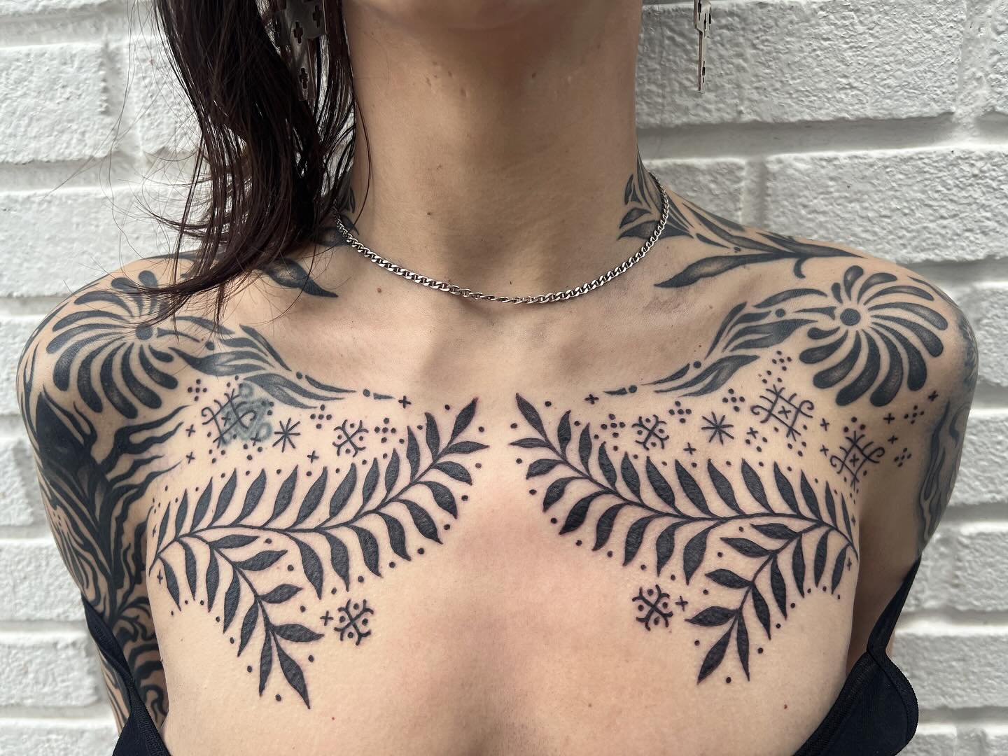 This image showcases a stunning display of tattoos that beautifully adorn the chest area. The intricate designs combined with the delicate necklace create an eye-catching look that speaks to personal expression and creativity. For those considering chest tattoos, choosing designs that resonate with one’s identity can make the art even more meaningful.