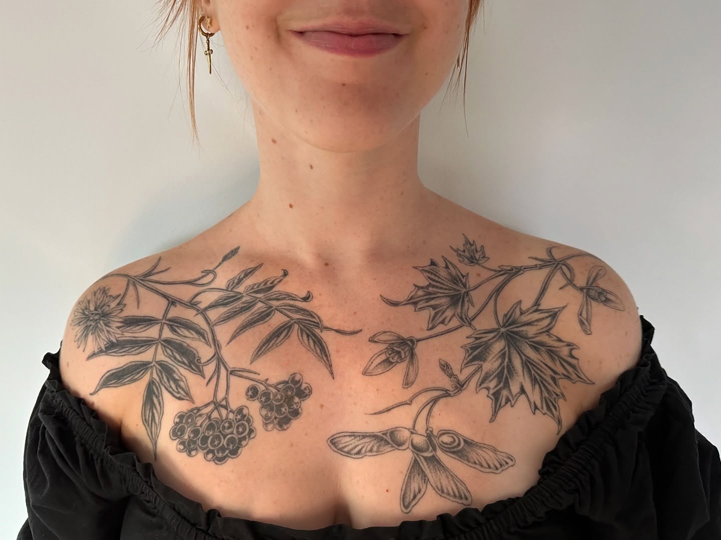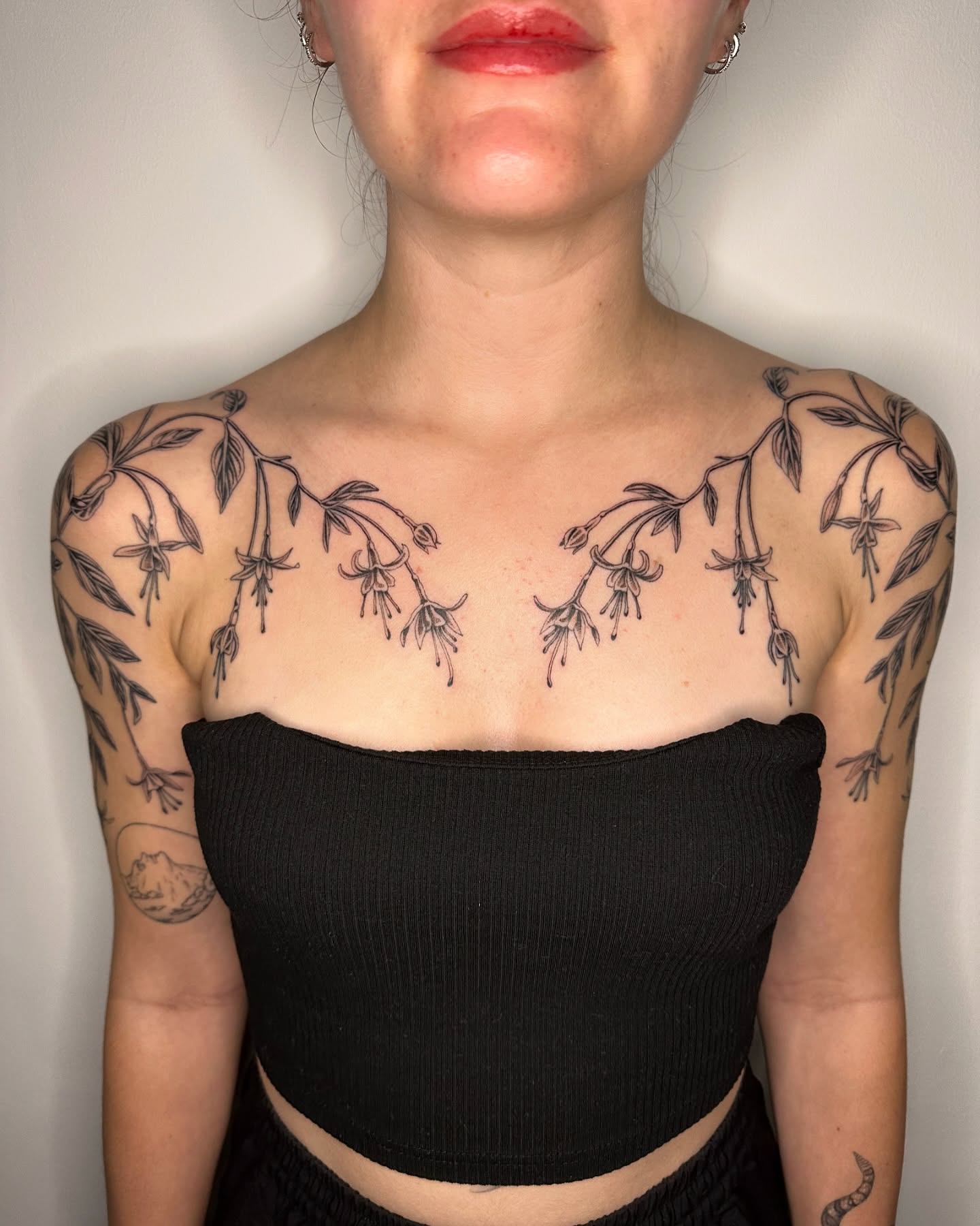 This image showcases a beautiful arrangement of floral tattoos that gracefully adorn the chest and shoulders. The intricate designs, featuring delicate leaves and flowers, create a stunning visual that highlights the wearer s unique style. For those considering similar body art, choosing designs that reflect personal significance can make the tattoos even more meaningful.