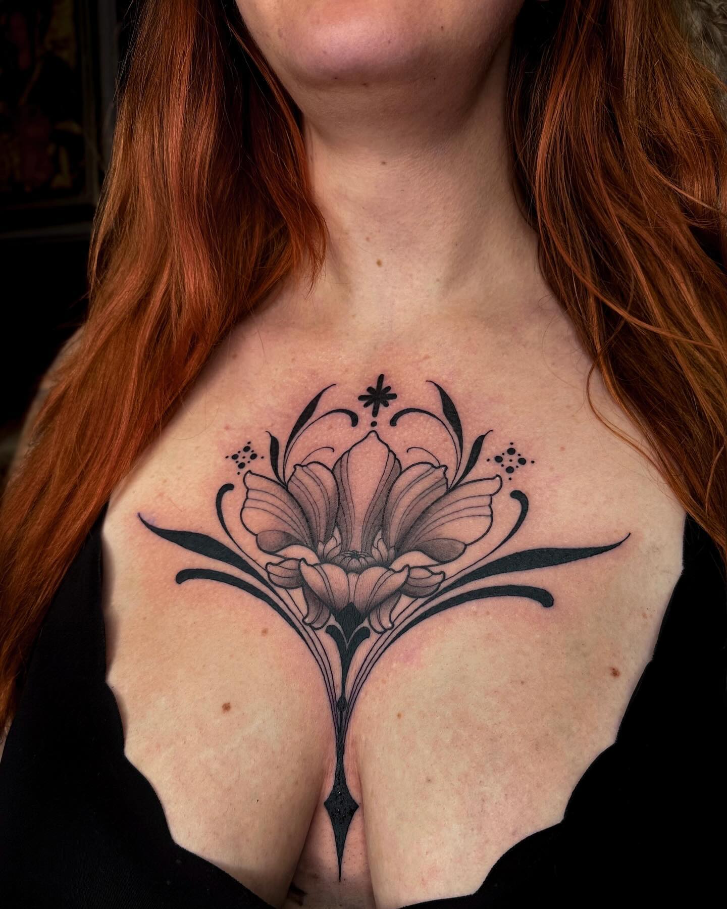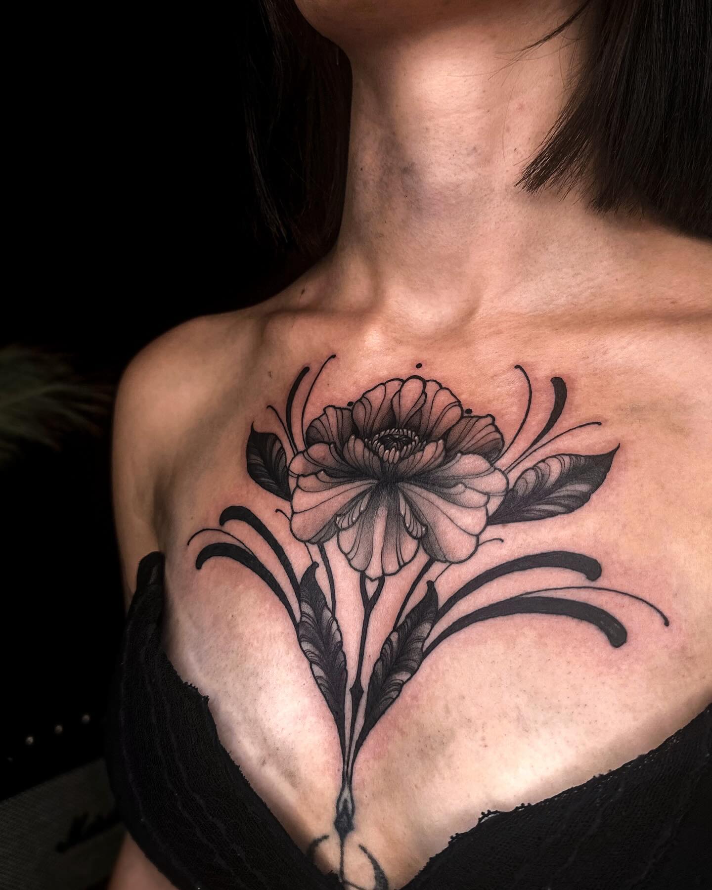 This striking tattoo features an elegant floral design that draws attention with its intricate details and bold lines. The combination of the flower and surrounding elements creates a stunning visual that beautifully complements the wearer s natural beauty. For those considering a chest tattoo, choosing a design that reflects personal meaning can make it even more special.