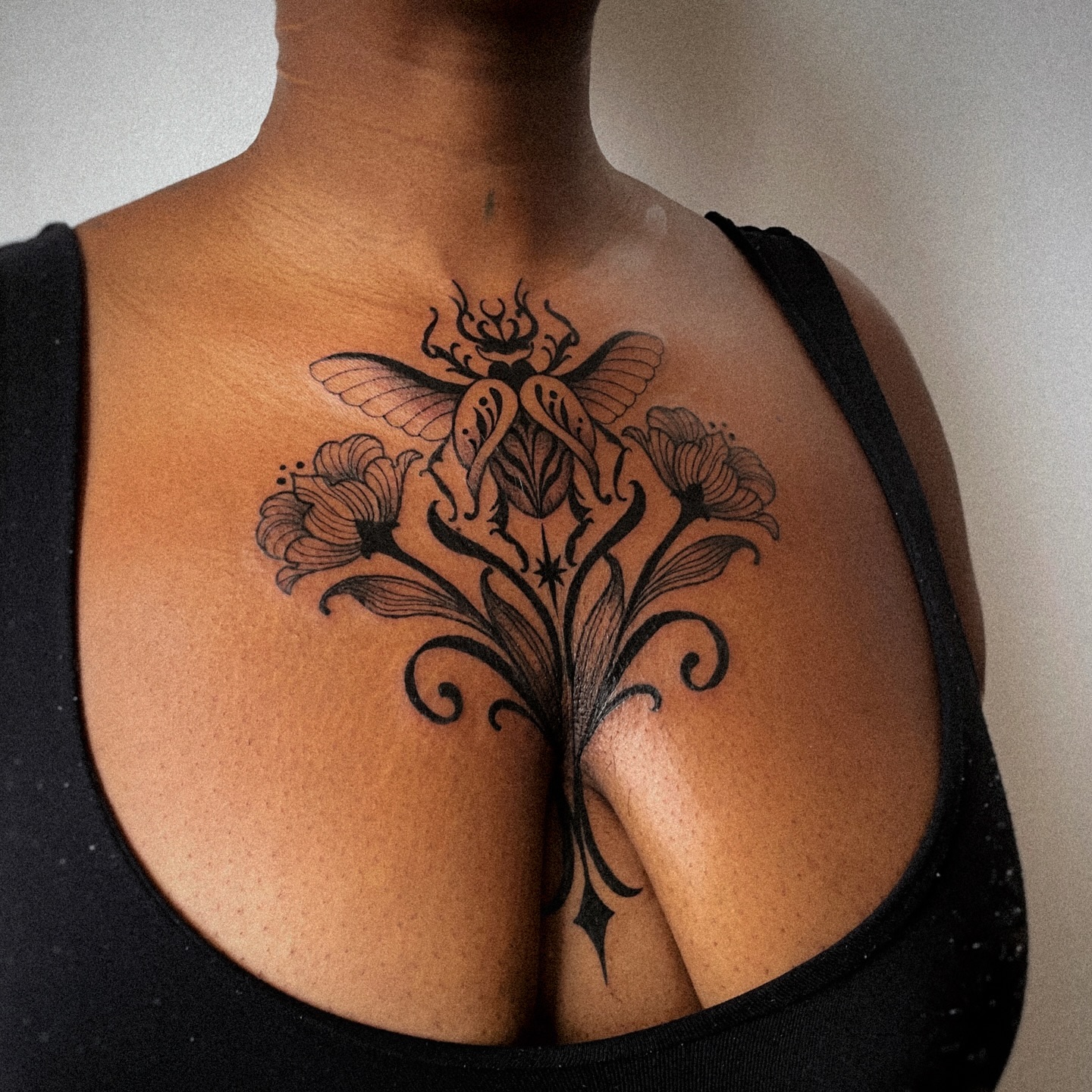 This image showcases a beautiful floral design that gracefully adorns the chest, blending artistry with personal expression. The delicate lines and intricate details of the flowers create a stunning visual that draws the eye, making it a remarkable choice for those who appreciate unique body art. When considering a chest tattoo, it’s important to think about how the design resonates with one’s personal story and style.