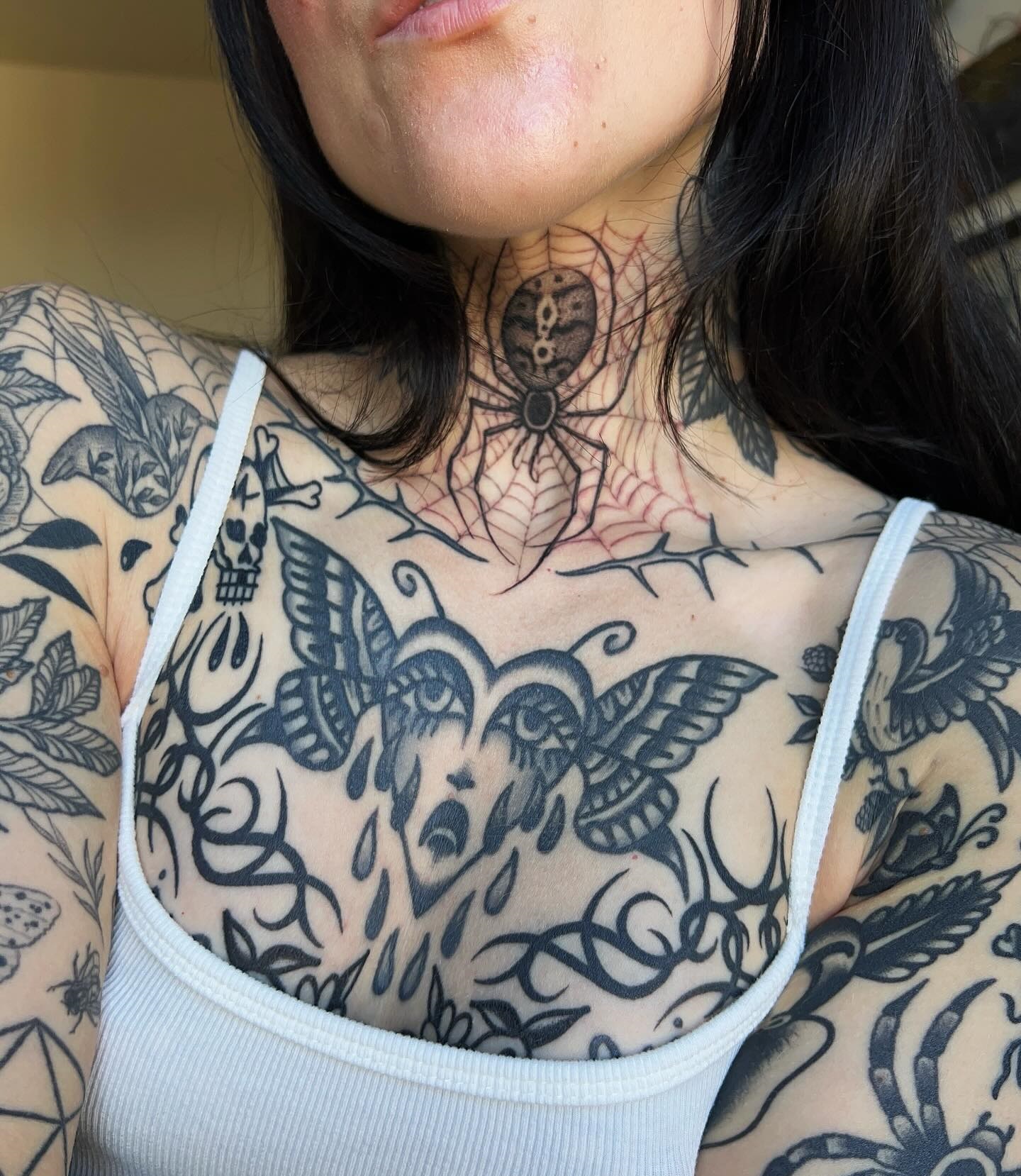 This image showcases a stunning display of chest tattoos, featuring intricate designs that tell a unique story. The combination of butterflies, a spider, and expressive motifs creates a visual narrative that draws the viewer in. For those considering chest tattoos, choosing meaningful symbols can make the artwork even more special.