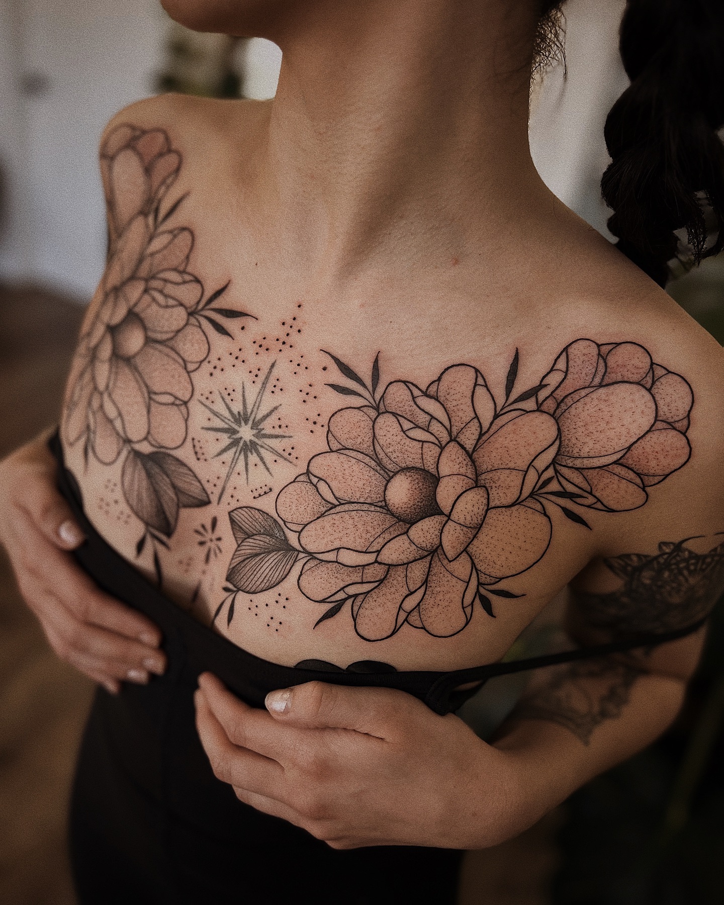 This striking image showcases beautifully detailed floral tattoos that gracefully adorn the chest. The intricate designs combine elegance with a touch of nature, making a powerful statement. For those considering similar artwork, choosing a design that reflects personal meaning can make the tattoo even more special.