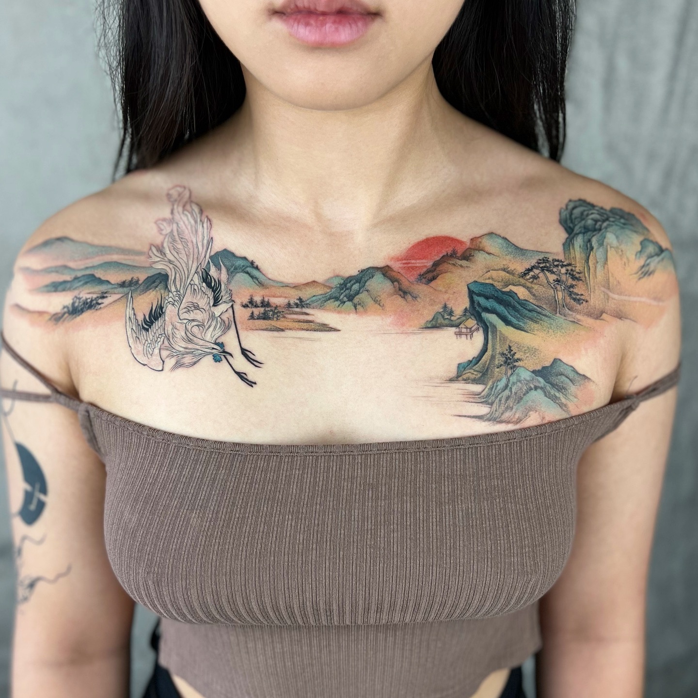 This stunning tattoo features a beautiful landscape that flows gracefully across the chest, bringing nature’s beauty to life. The delicate details of the mountains and the soft colors create a serene vibe, allowing the wearer to express their love for the outdoors. For those considering chest tattoos, choosing a design that reflects personal interests can make the artwork even more meaningful.
