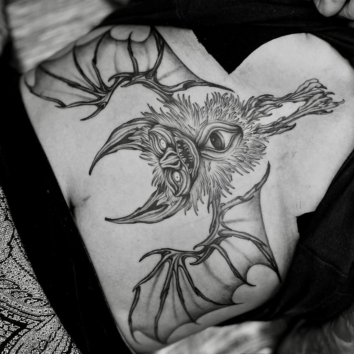 This striking tattoo features a unique creature that blends elements of a bat and a mythical being, making it truly stand out. The intricate details and bold lines capture the imagination, showcasing the artistry involved in chest tattoos for women. For those considering a similar design, embracing originality can lead to a personal piece that tells a story.