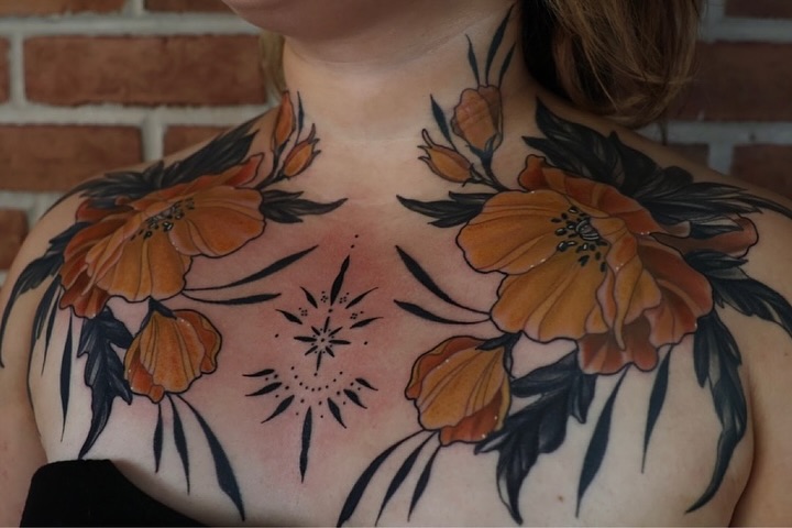 This stunning chest tattoo features vibrant orange flowers that beautifully blend with intricate black details. The design not only enhances the natural curves of the body but also tells a story of creativity and self-expression. Choosing a floral theme can evoke feelings of warmth and positivity, making it a delightful choice for many women.