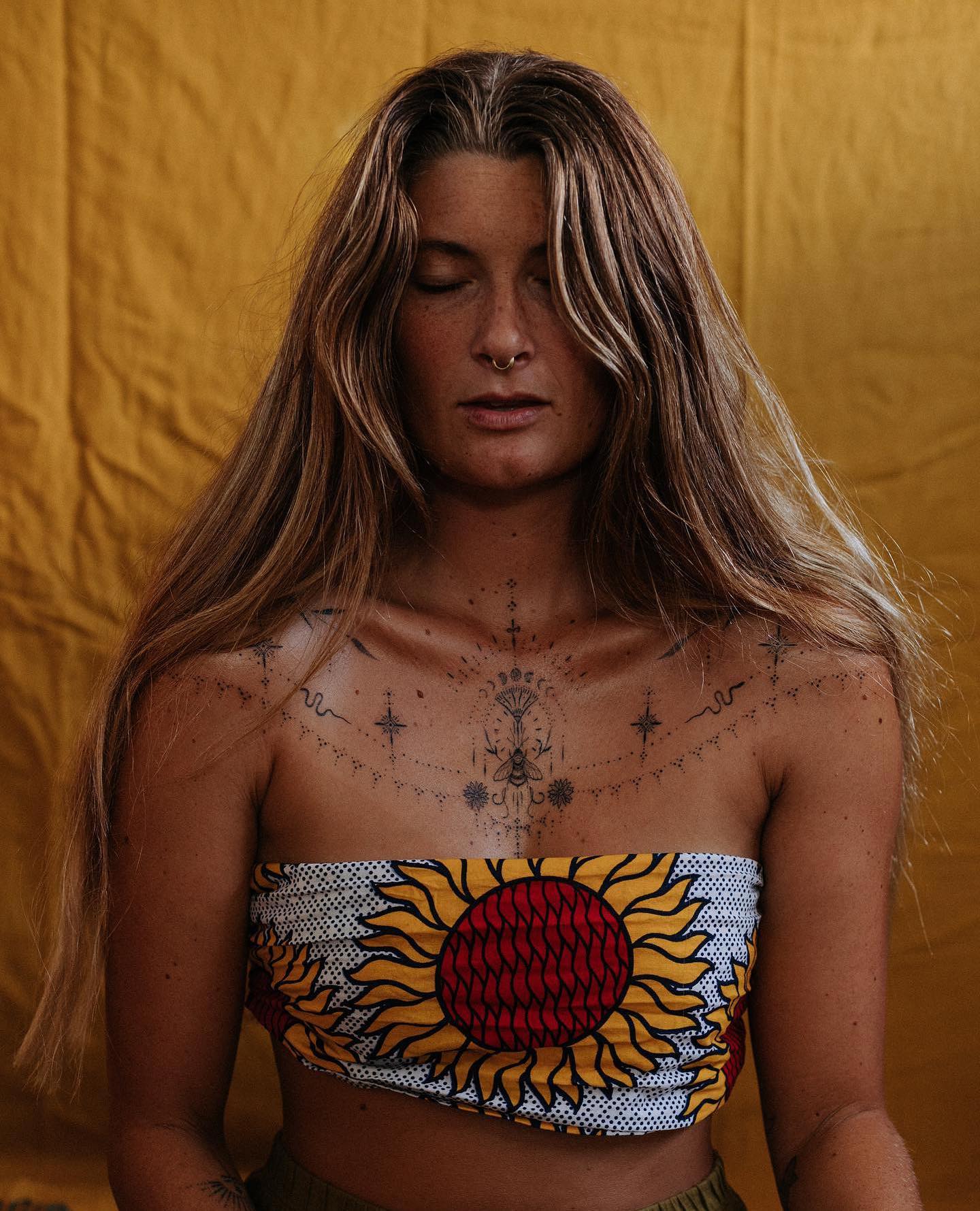This image showcases a woman with stunning chest tattoos that blend beautifully with her vibrant outfit. The intricate designs, including floral elements and delicate lines, create a striking visual harmony against the golden background. For those considering a chest tattoo, it s essential to choose designs that resonate personally, as they can tell a unique story about one s journey.