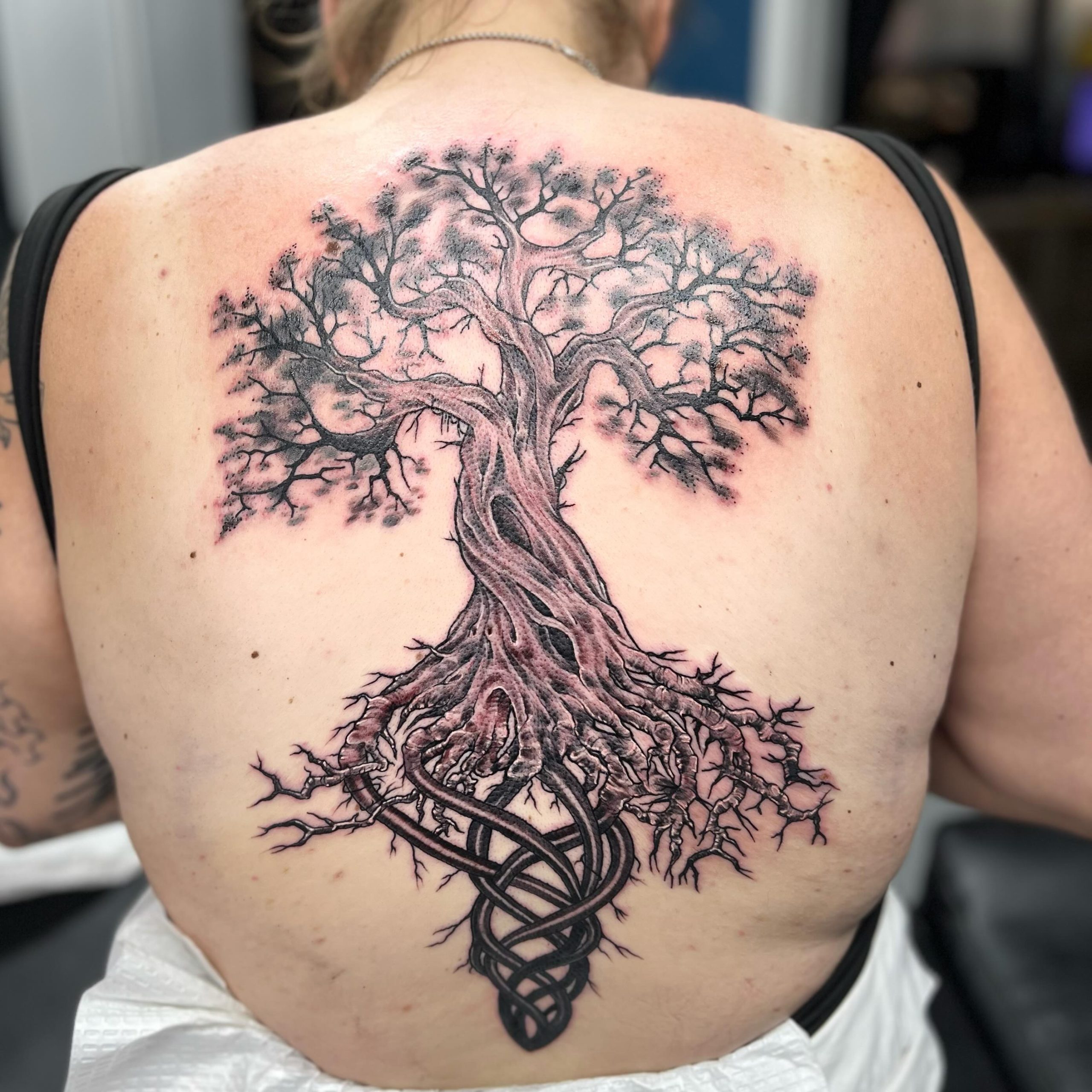The tattoo features a detailed tree design with twisting roots and a wide canopy of branches.