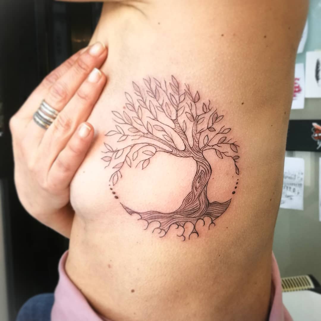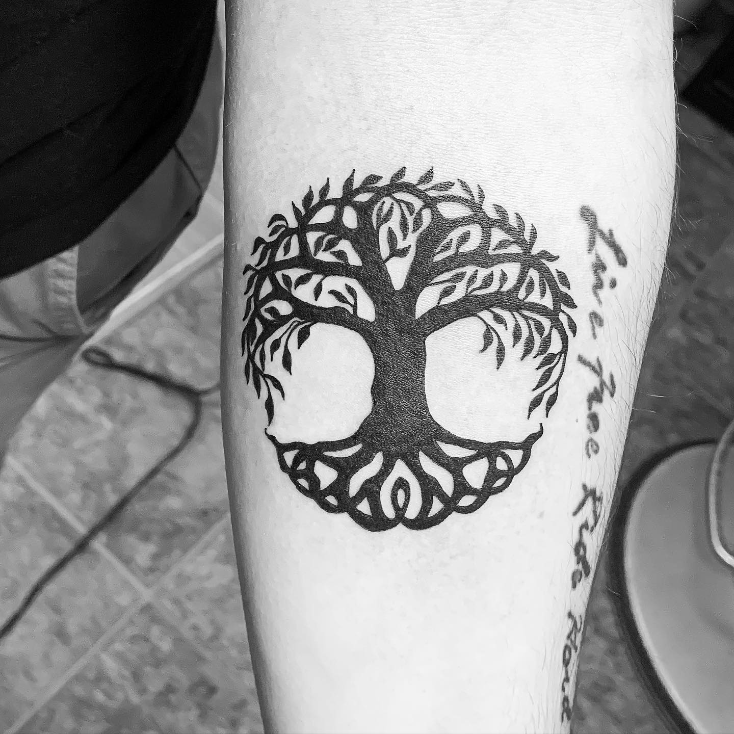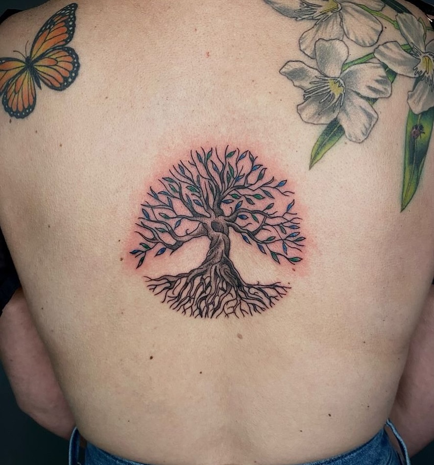 The tattoo features a detailed tree with sprawling branches and roots that create a circular shape.