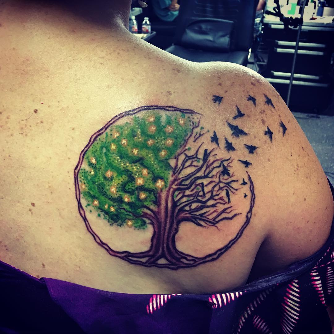 The tattoo features a split design of a tree, showcasing vibrant green leaves on one side and bare branches on the other.